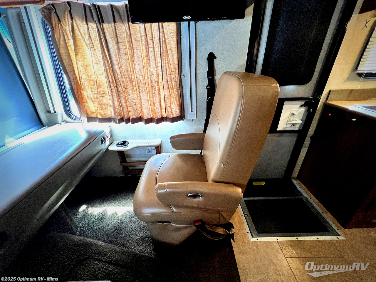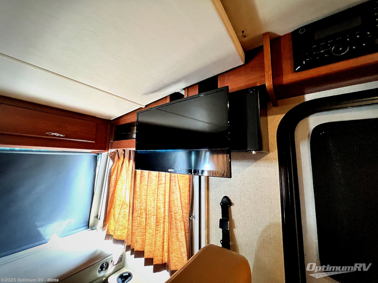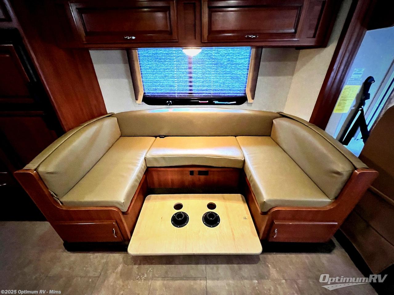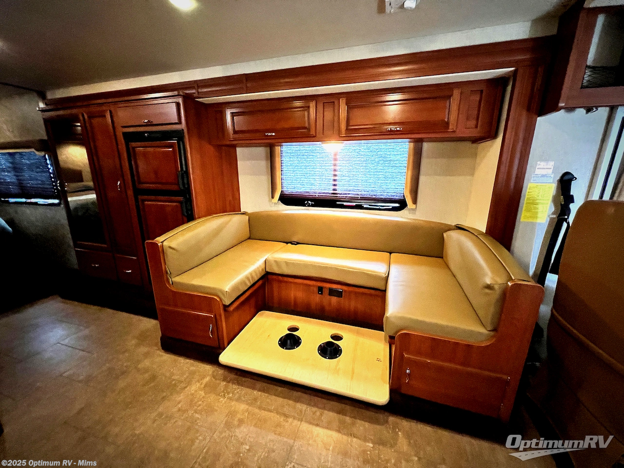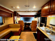 As you enter notice the 32" LED TV above the cab area for enjoyment. Look back to the rear of the coach and see plenty of seating to enjoy all of your meals at including three sets of seat belts on the u-shaped dinette. This slide out also features a refrigerator and wardrobe/pantry.