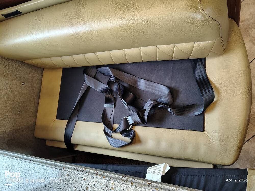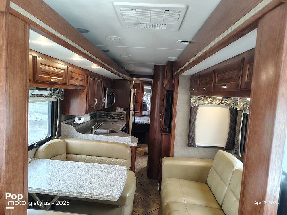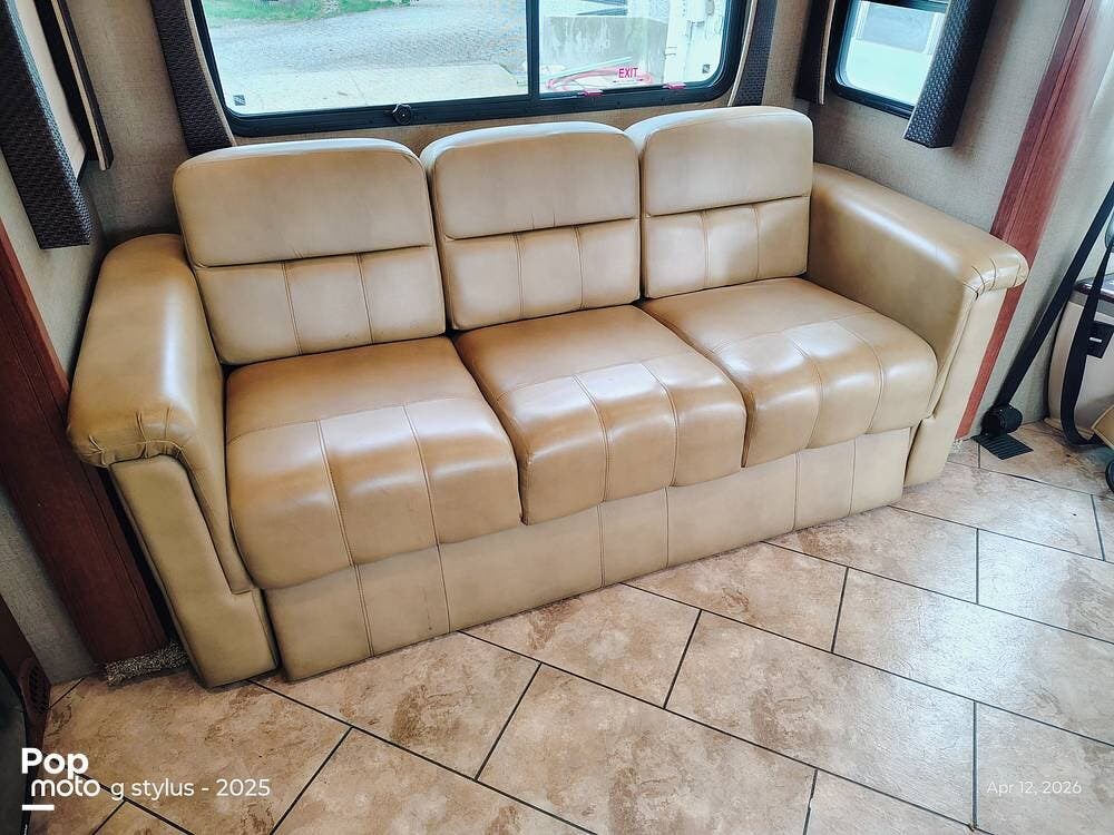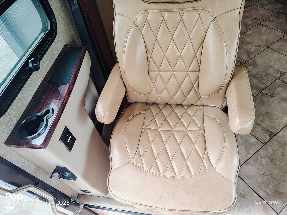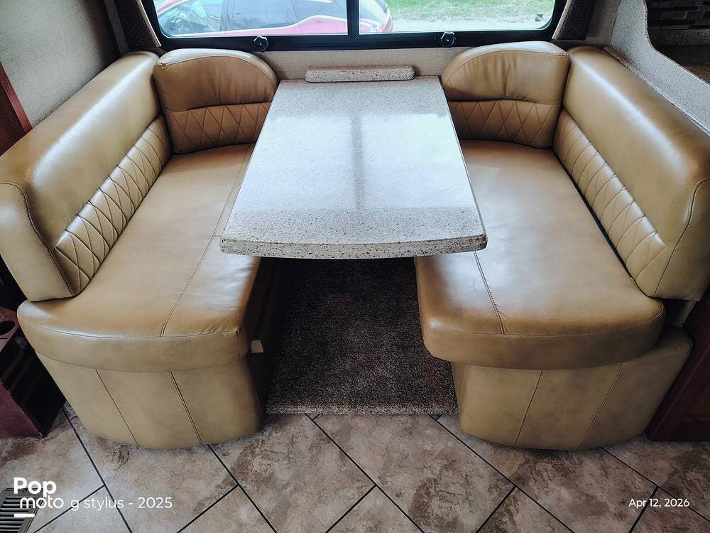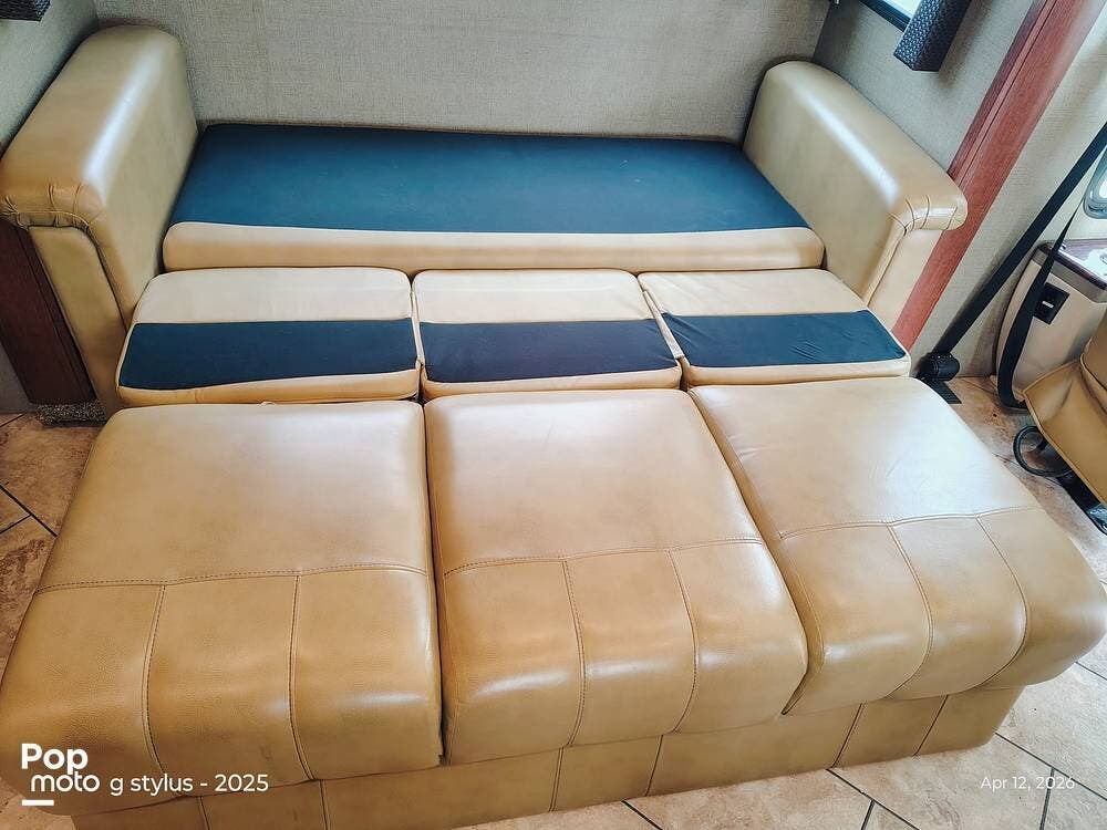 The leather seating interior includes a convertible dinette and a sofa sleeper with a queen-sized bed