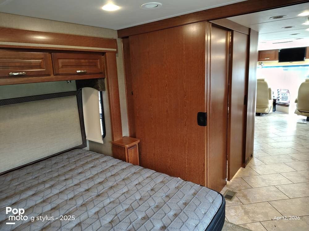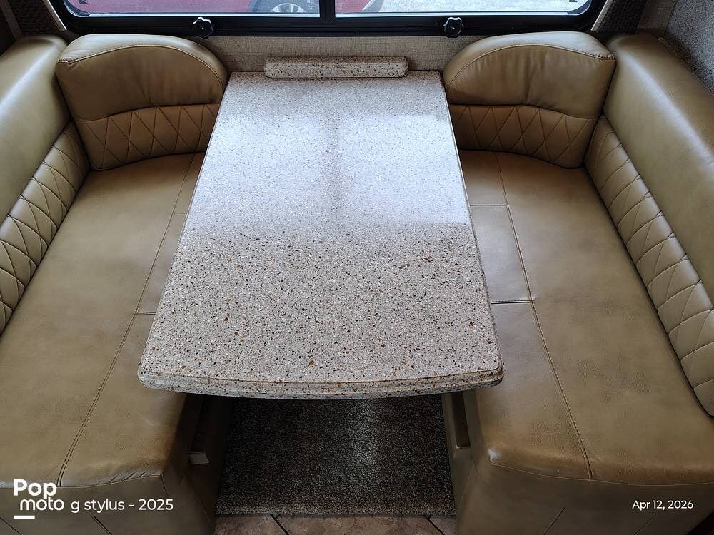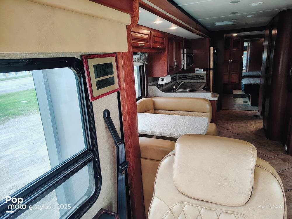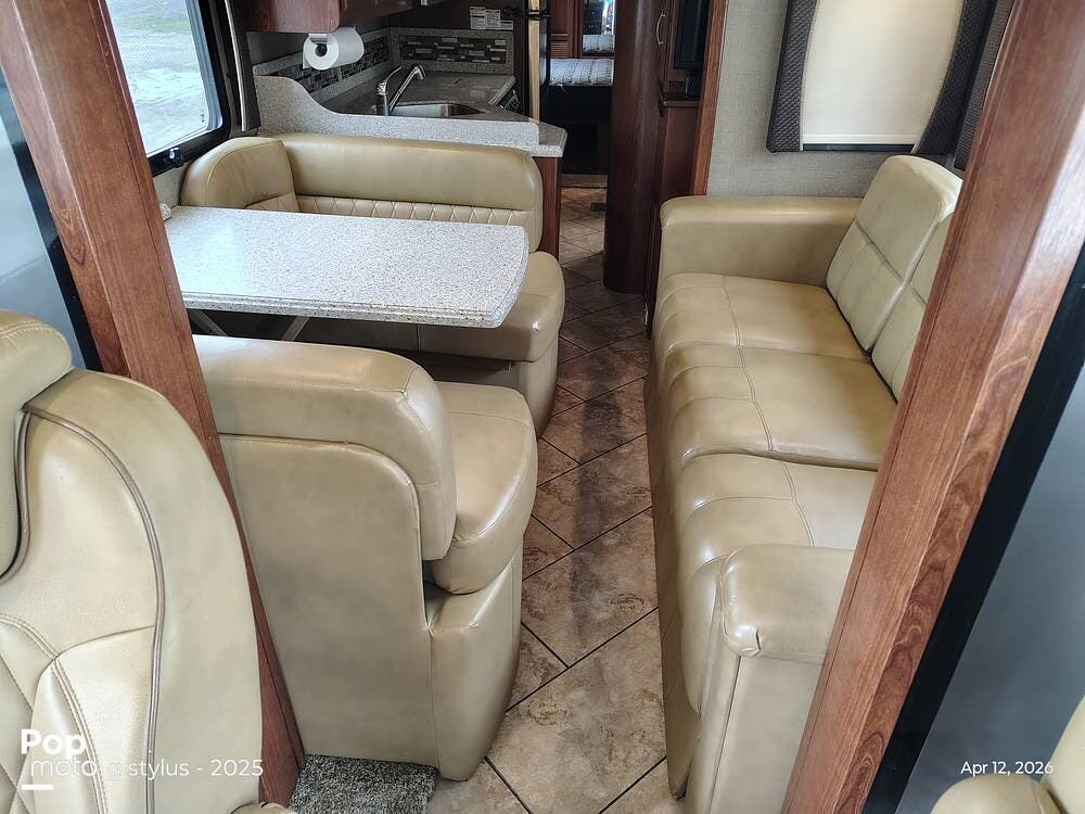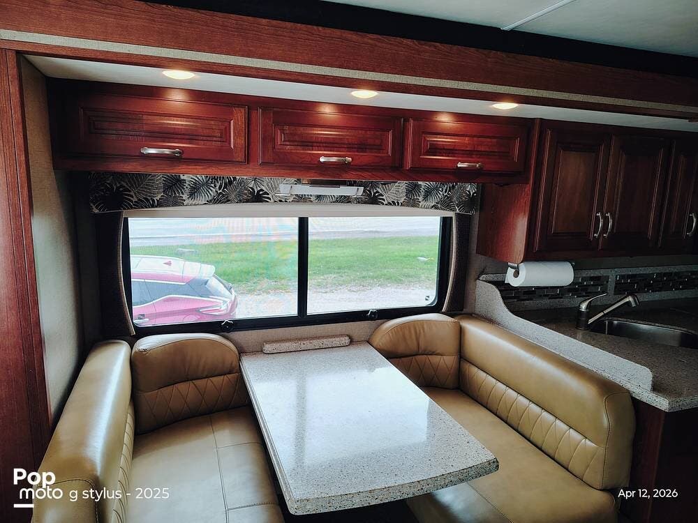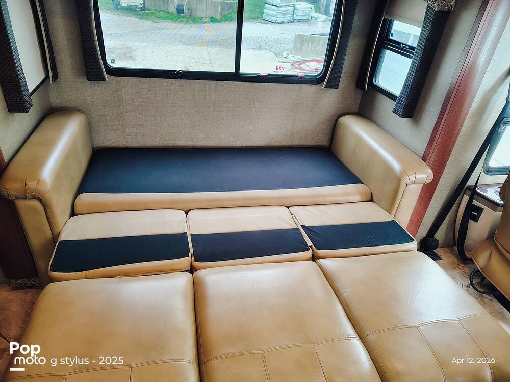 The leather seating interior includes a convertible dinette and a sofa sleeper with a queen-sized bed