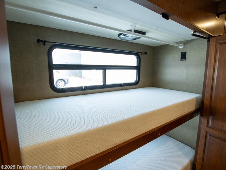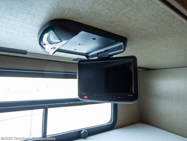 Opposite the bathroom find a set of slide out bunks for the kids. They each feature flip down LCD monitors. Also part of this slide out is the master bedroom chest of drawers and 32" LED TV. Opposite the chest of drawers find a queen size bed slide out including nightstands and an overhead storage cabinet. There is also a large rear wall wardrobe with sliding doors, plus a space that is prepped for a two piece washer/dryer.