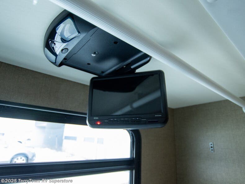 Opposite, along the driver side is a second slide which really opens up the floor space. Here you will enjoy added seating with a booth dinette and L-shaped expandable sofa, or you can choose an optional free standing dinette and hide-a-bed sofa. Both feature overhead cabinets to keep things neatly tucked away and organized. Adjacent to the L-sofa enjoy a LED TV and fireplace.