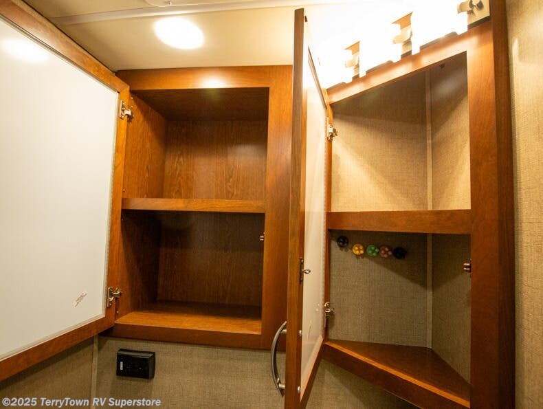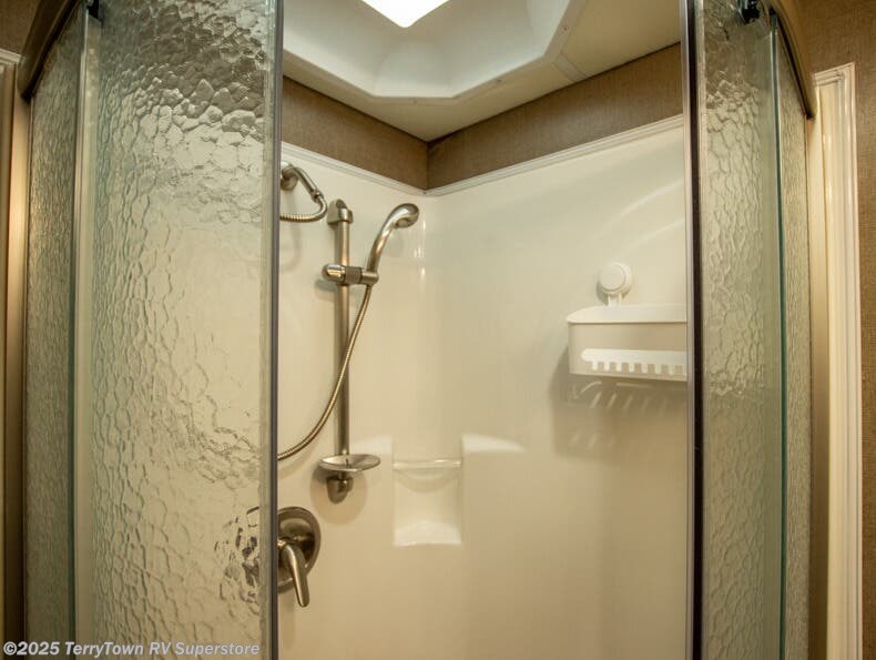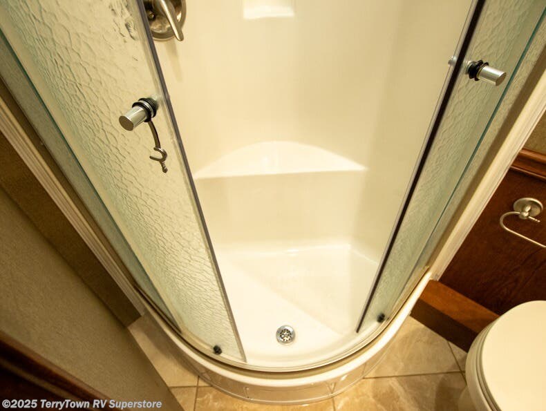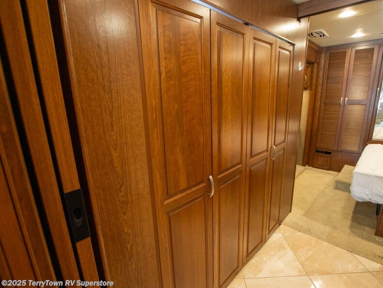 Continuing toward the rear of the coach you will pass a complete bath with corner shower, toilet, and sink, plus linen cabinet. The door is a pocket door which maximizes the hall space keeping it very open.