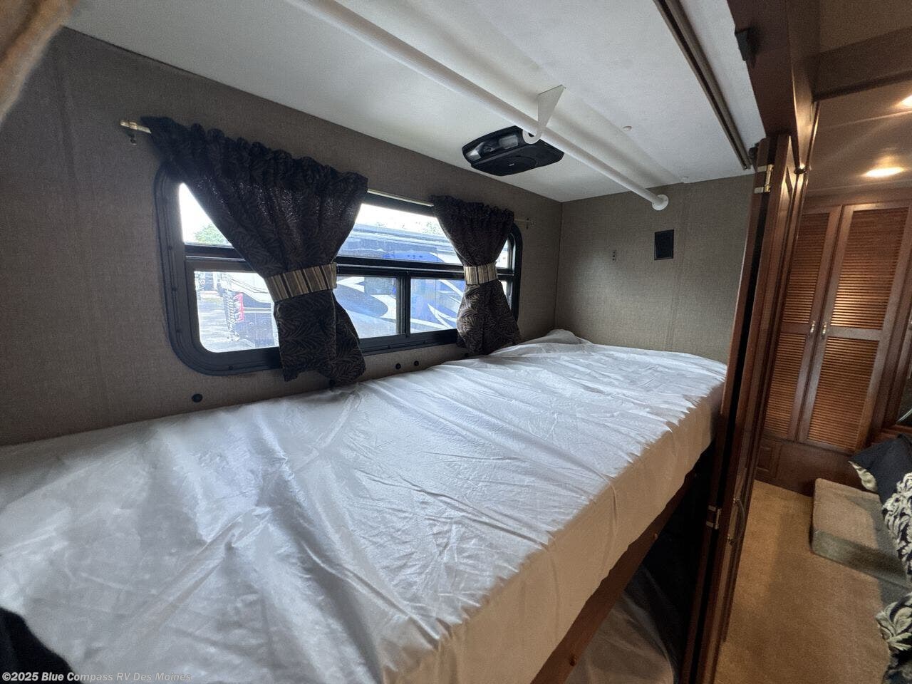Opposite the bathroom find a set of slide out bunks for the kids. They each feature flip down LCD monitors. Also part of this slide out is the master bedroom chest of drawers and 32" LED TV. Opposite the chest of drawers find a queen size bed slide out including nightstands and an overhead storage cabinet. There is also a large rear wall wardrobe with sliding doors, plus a space that is prepped for a two piece washer/dryer.