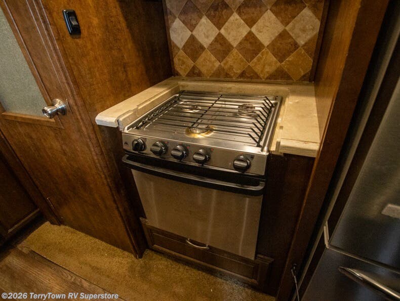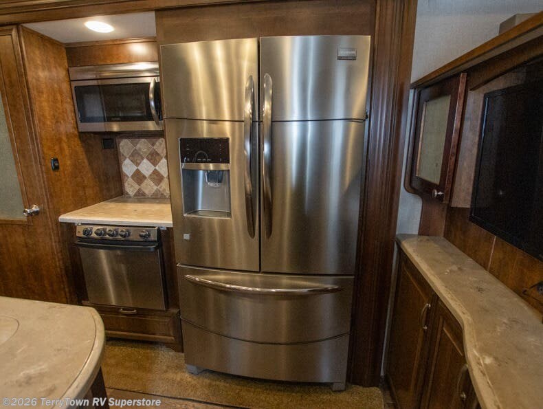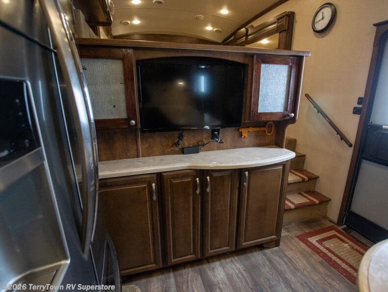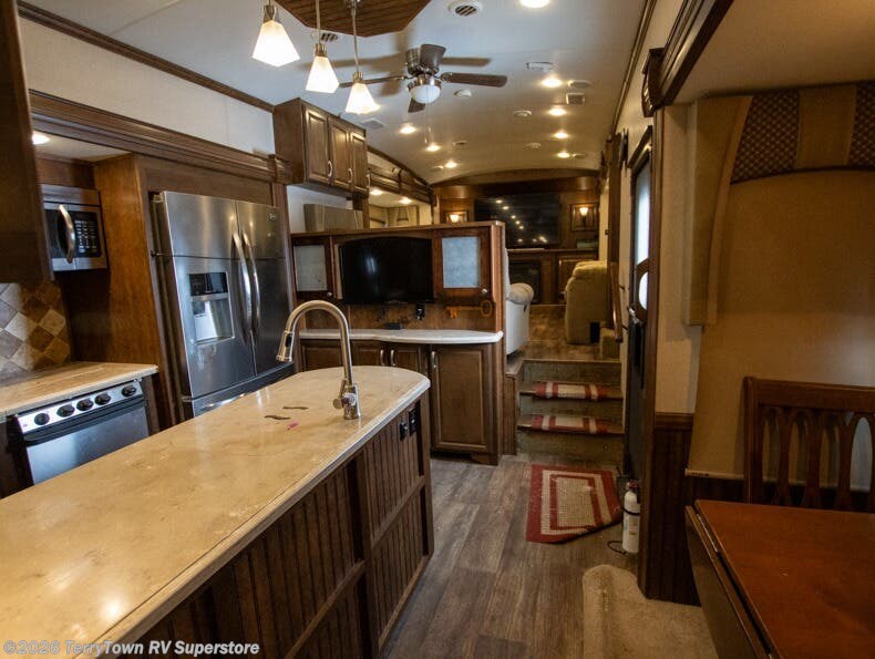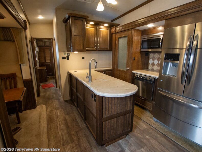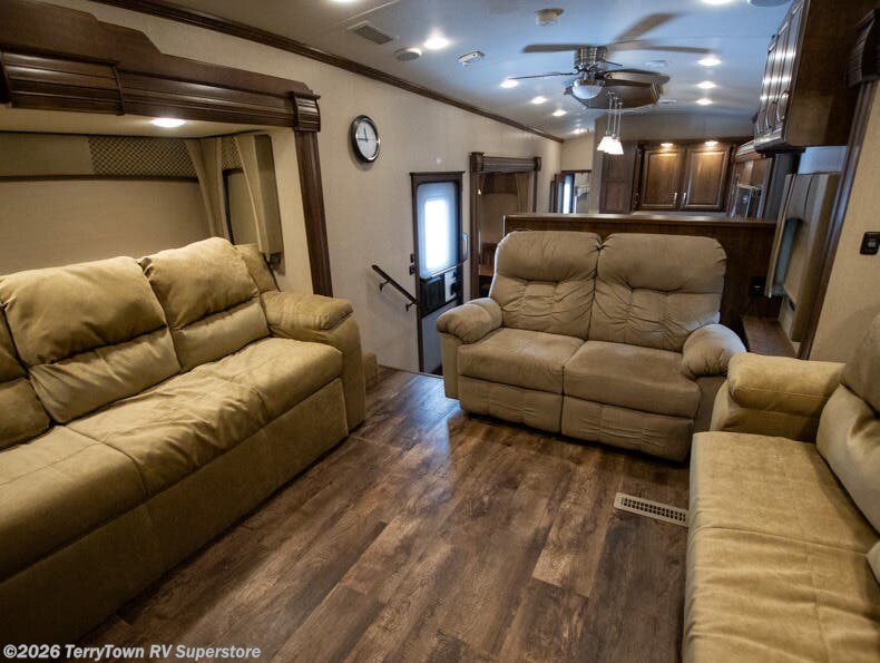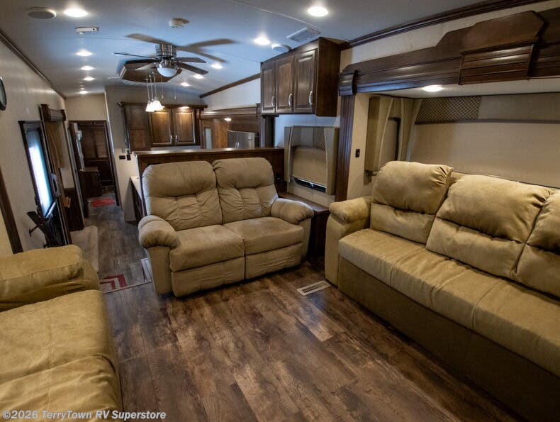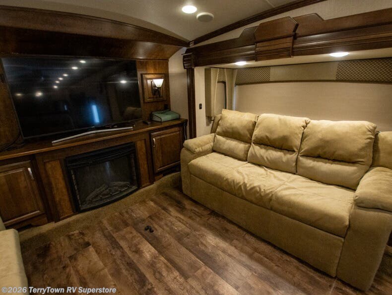 As you enter the fifth wheel, step up to the right to a front living area. There are two slides, one on either side of the fifth wheel. Both slides have a comfortable sofa. There is also theater seating with overhead cabinets, and along the front wall you can watch TV on the 58" LED TV and enjoy the fireplace just below.