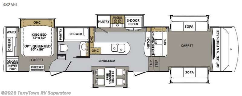 The Cardinal 3825FL fifth wheel by Forest River offers so much room from five slides, dual entries, and a front living area. You will be wowed by the number of features this fifth wheel has to offer!