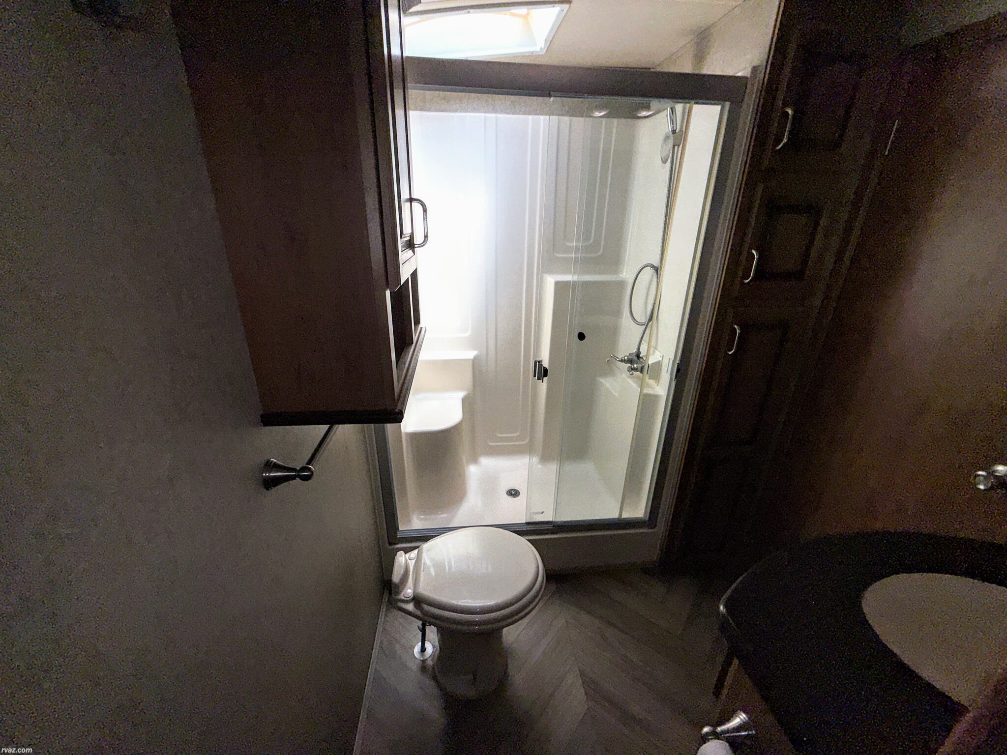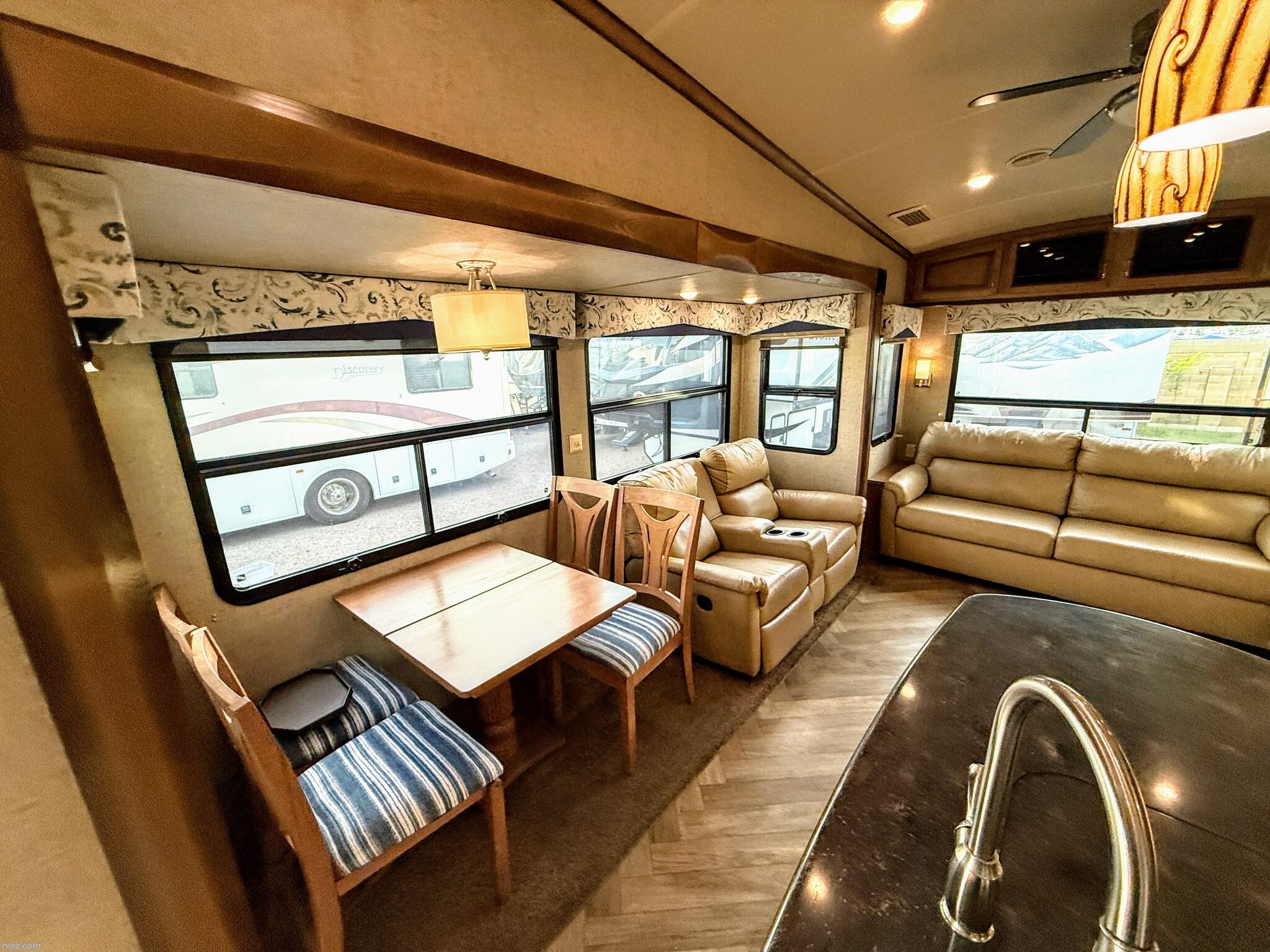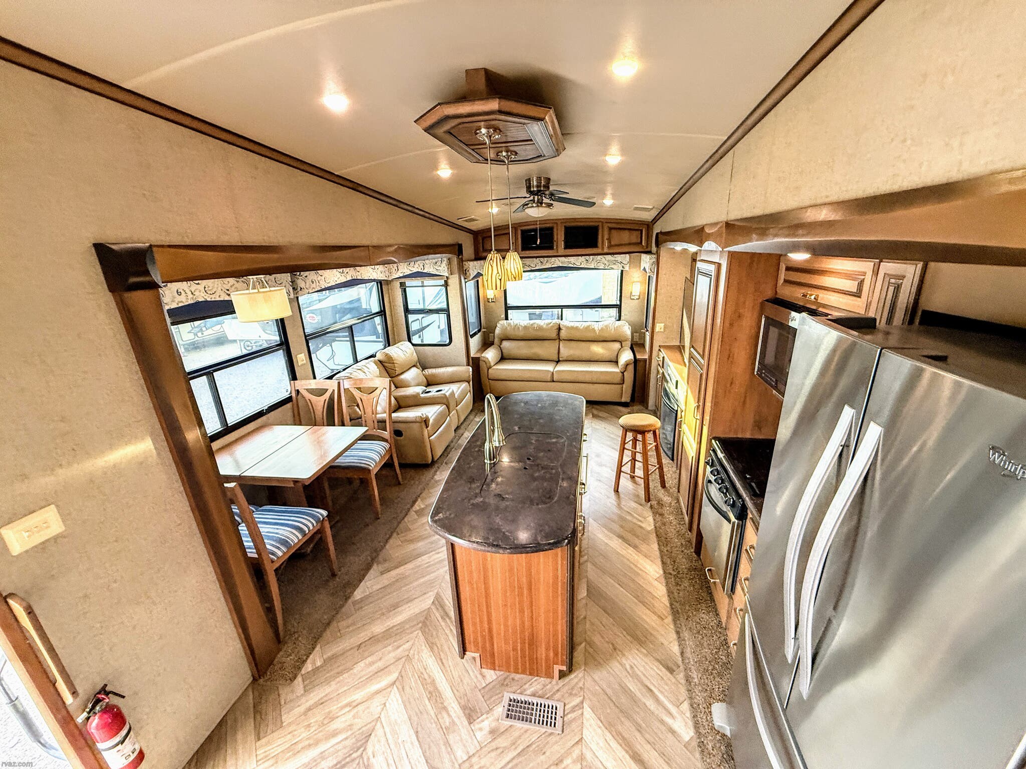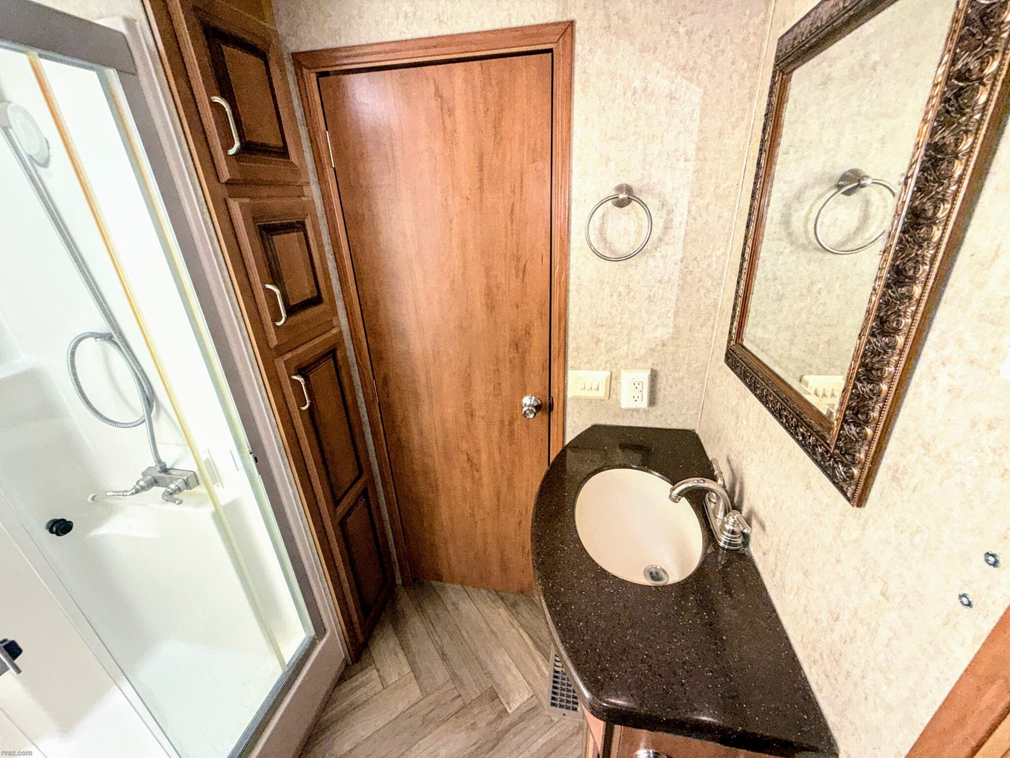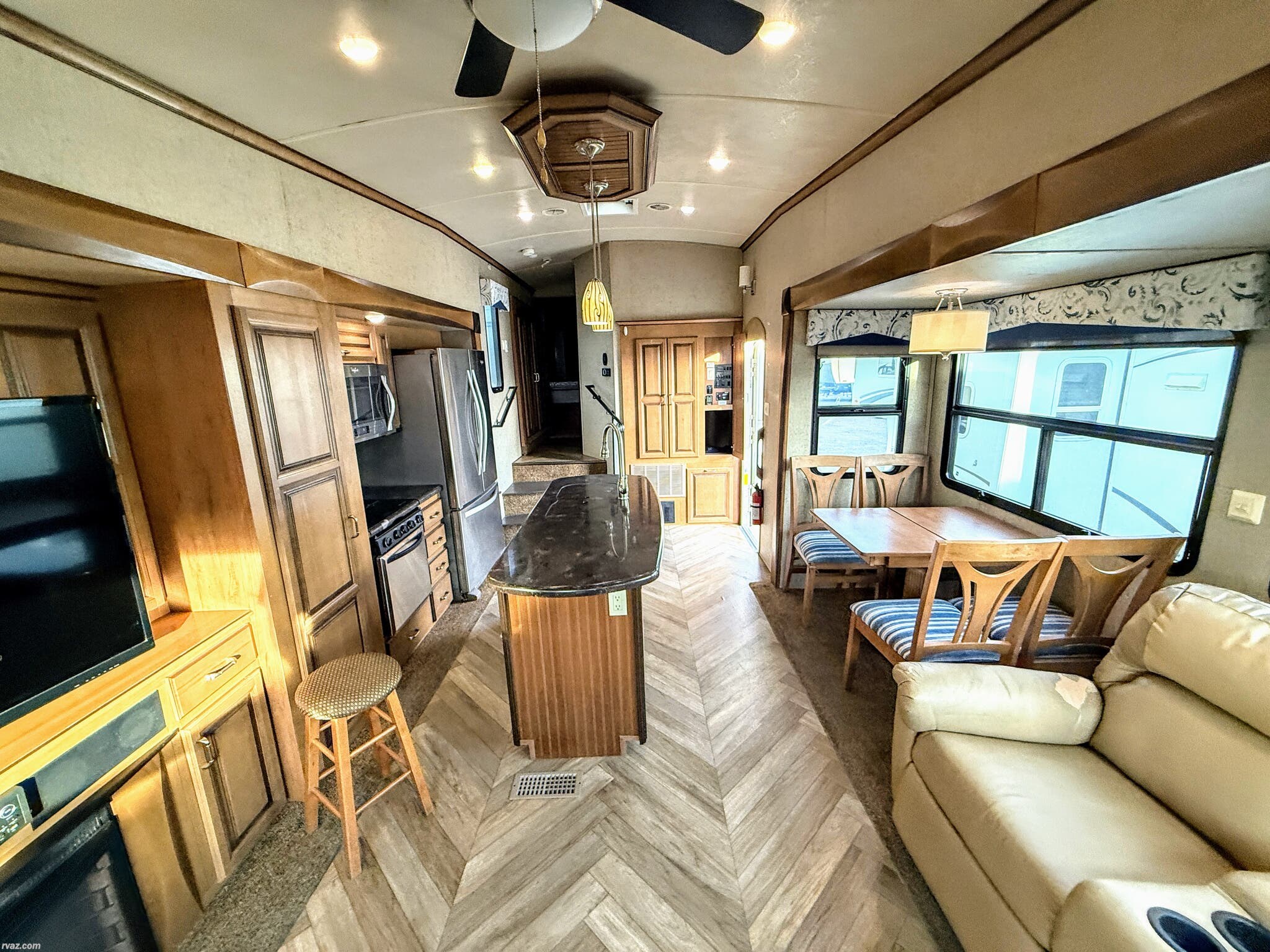 Ceiling Fan, Central Vacuum, Day/Night Shades, Fireplace, Free Standing Dinette w/Chairs, Glass Shower Door, Island Kitchen, Kitchen Sink, Leather Furniture, Medicine Cabinet, Non-Smoking Unit, Overhead Cabinetry, Rocker Recliner(s), Roof Vents, Self Contained, Shower, Solid Surface Countertops, Toilet -