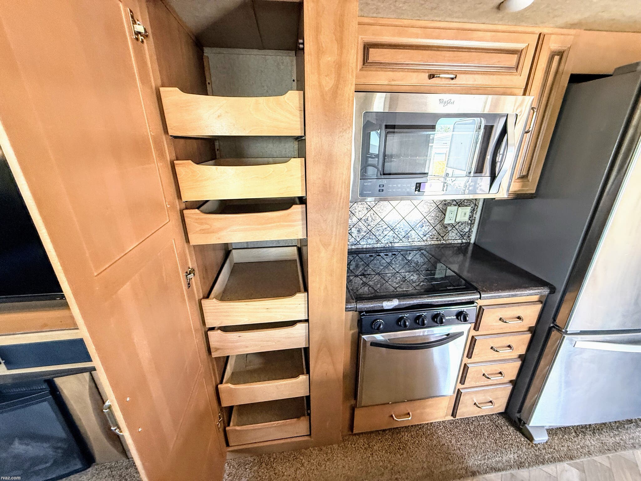 This fifth wheel is packed with premium features, including a microwave, oven, refrigerator, and stove top burner—providing everything needed to prepare delicious meals on the road. Safety is prioritized with smoke, CO, and LP detectors, while comfort is enhanced by an exterior awning, outdoor speakers, skylights, roof vents, and a power roof vent for optimal airflow. Additional amenities like a TV, surround sound system, DVD/CD player, and exterior ladder make this model as entertaining as it is practical.