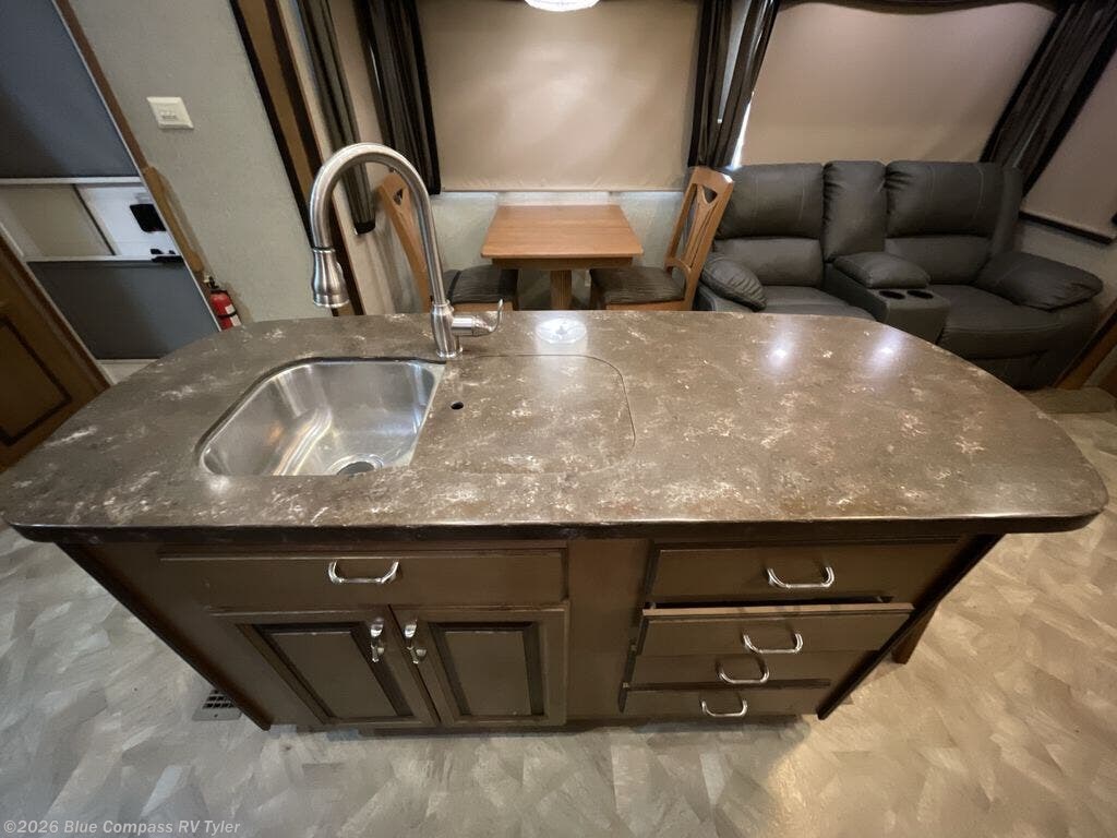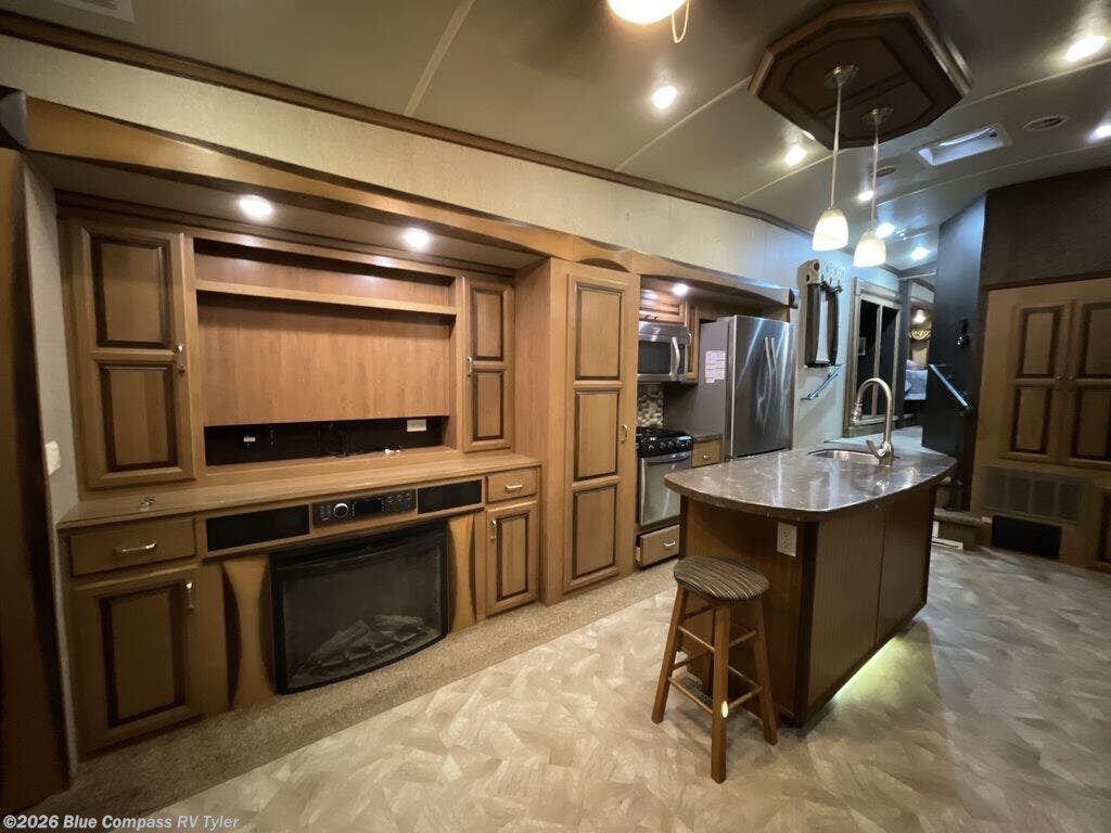 As you enter the fifth wheel, to the left is a slide with a table, and two lounge chairs. Along the rear wall is a sofa. The other slide has an entertainment center, fireplace, desk, pantry with drawers, three burner range, microwave, additional pantry, and refrigerator. You are also sure to enjoy the kitchen island with the double kitchen sink and an optional dishwasher. There is a closet near the entry.