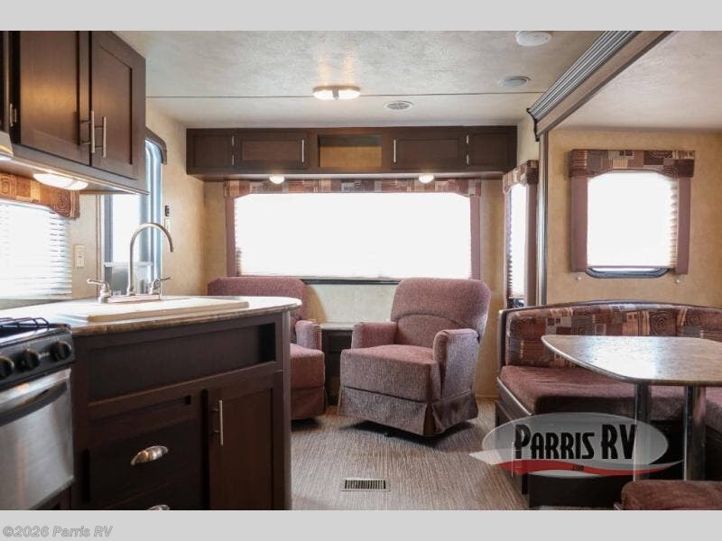 The single slide out features a U-shaped dinette and a pantry/linen cabinet. Next to the slide is an entertainment center. On the opposite side of the trailer is an angled countertop with a kitchen sink, three burner range, overhead cabinets, and a refrigerator.