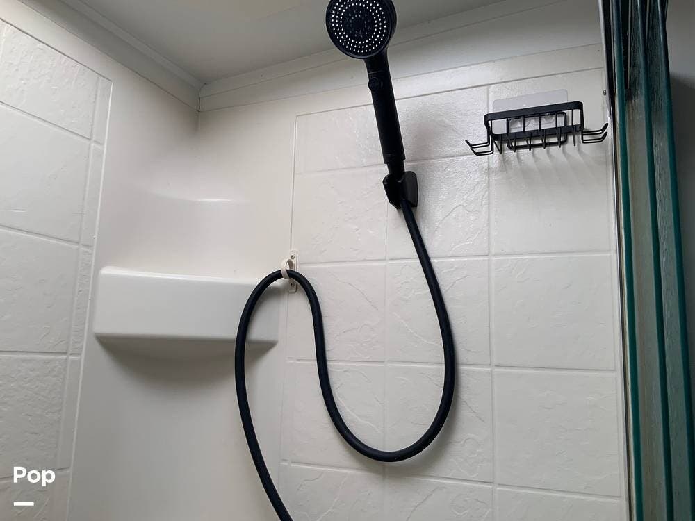 The bathroom is roomy and practical, with a large shower and generous storage.