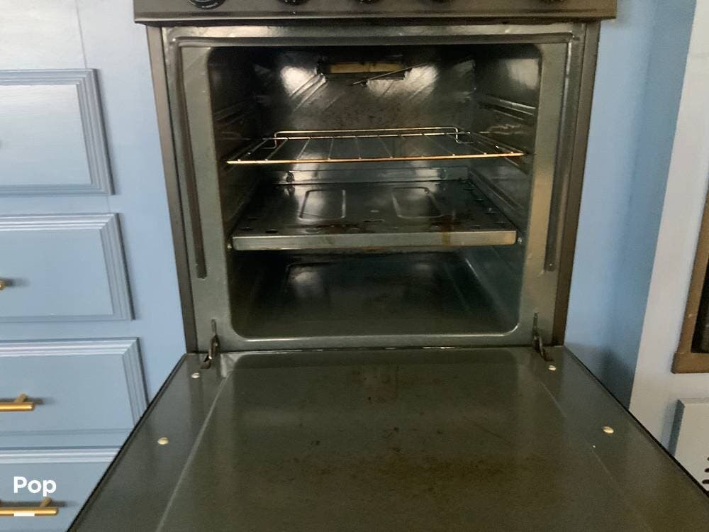 The mid-coach kitchen is set up for real cooking, with a 3-burner range and oven, microwave, dual-door refrigerator, and plenty of cabinet space.
