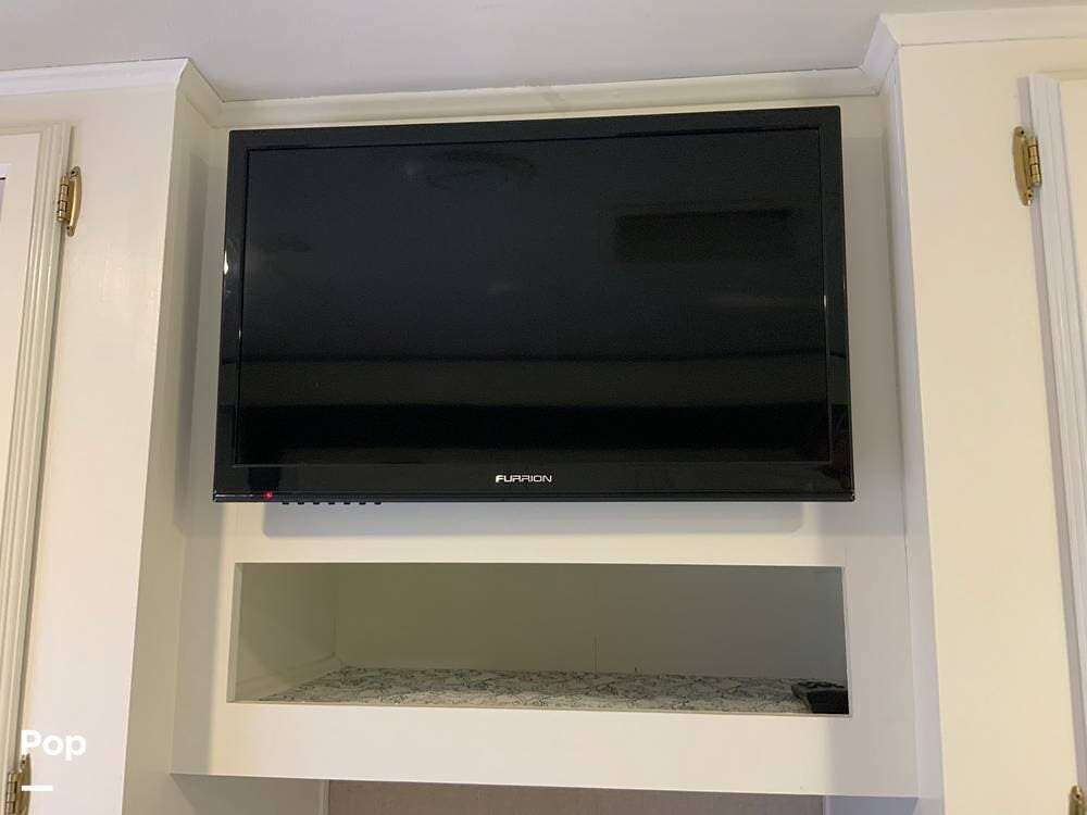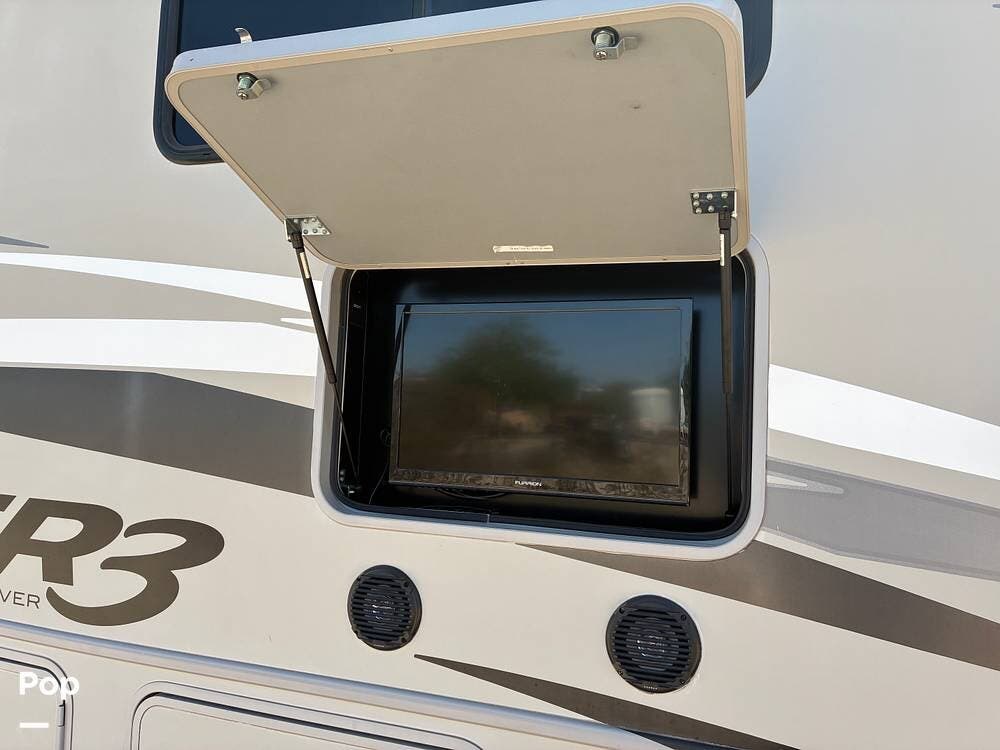 Entertainment is covered inside and out with multiple interior TVs, an exterior TV and speaker setup, and a Bluetooth media system.