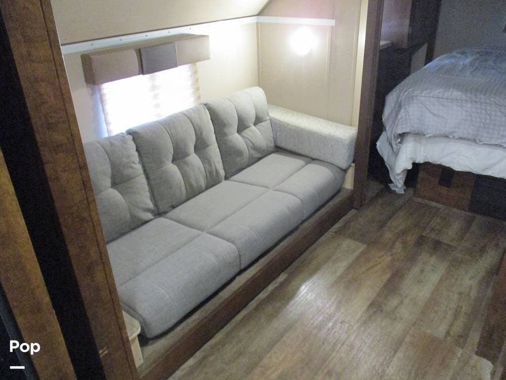 Off the kitchen are the bunks with a sofa/sleeper on the bottom and a flip-up bunk above. Across is another flat screen TV to enjoy.