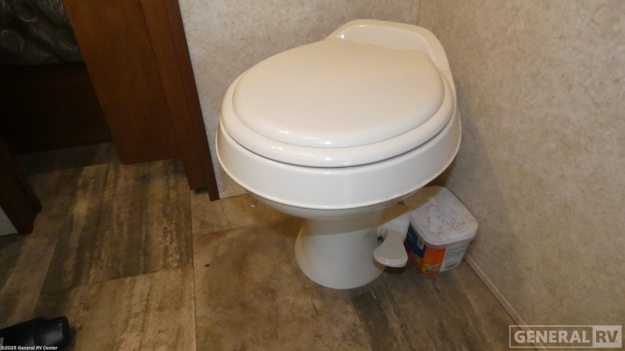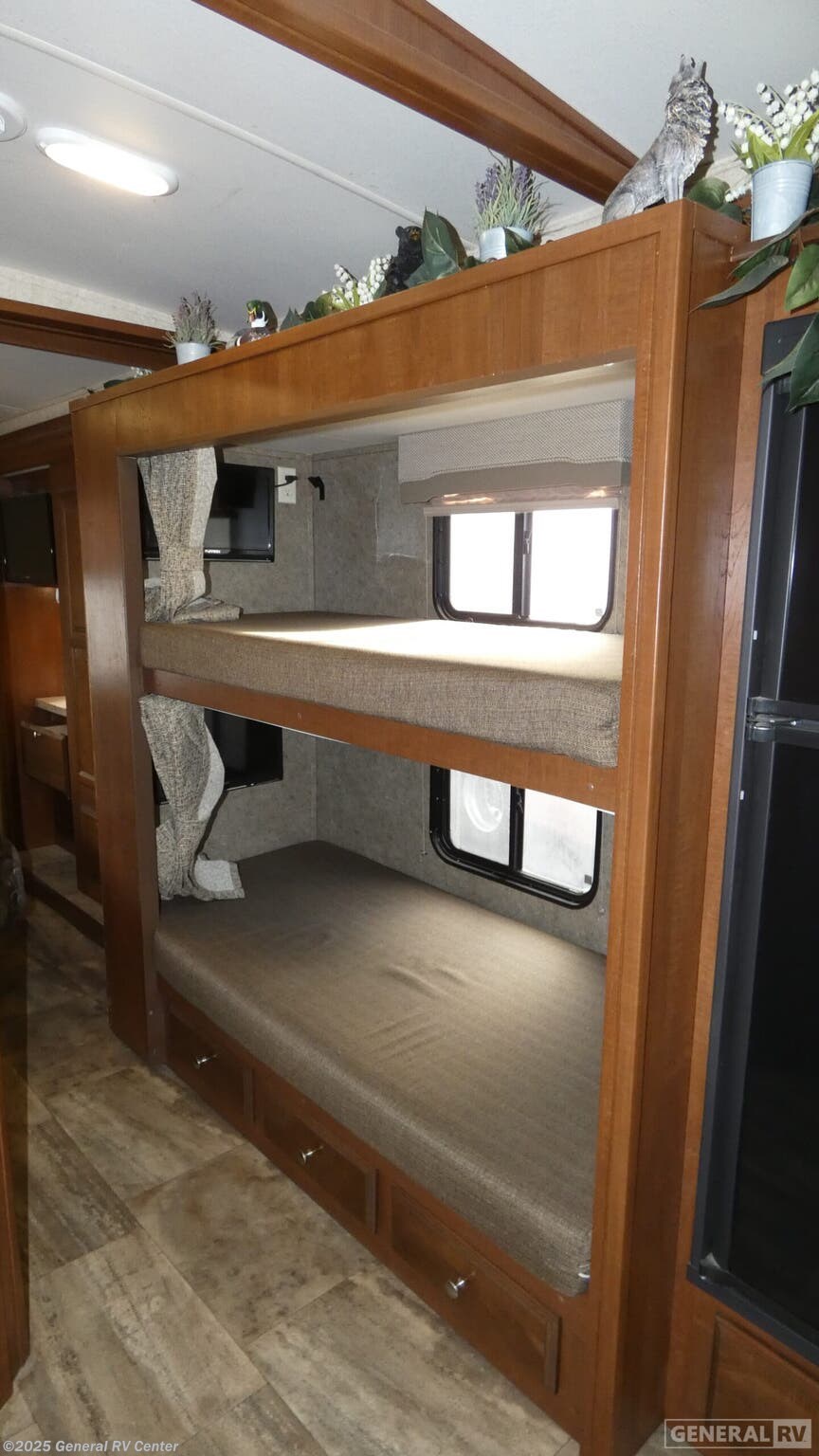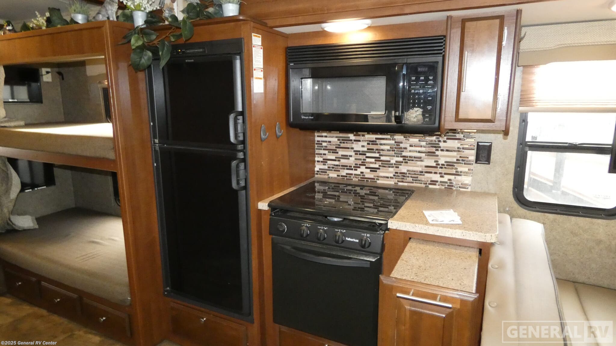 A full wall slide and plenty of comfortable living space is what you will find in the Georgetown 3 Series 31B3 motor home by Forest River. Step inside and find luxury and convenience at your fingertips. To the left of the entrance there is a double kitchen sink, overhead cabinet, and pantry for your dry goods. To the right of the entry door you will find a sofa and an overhead cabinet. The wall slide features a dinette with a TV above, microwave, three burner range, refrigerator, bunks, wardrobe, and TV. In the rear bedroom there is a queen bed, nightstands, and overhead cabinet. Leaving the bedroom you will find the side aisle bathroom with a toilet, sink, and corner shower, plus so much more!