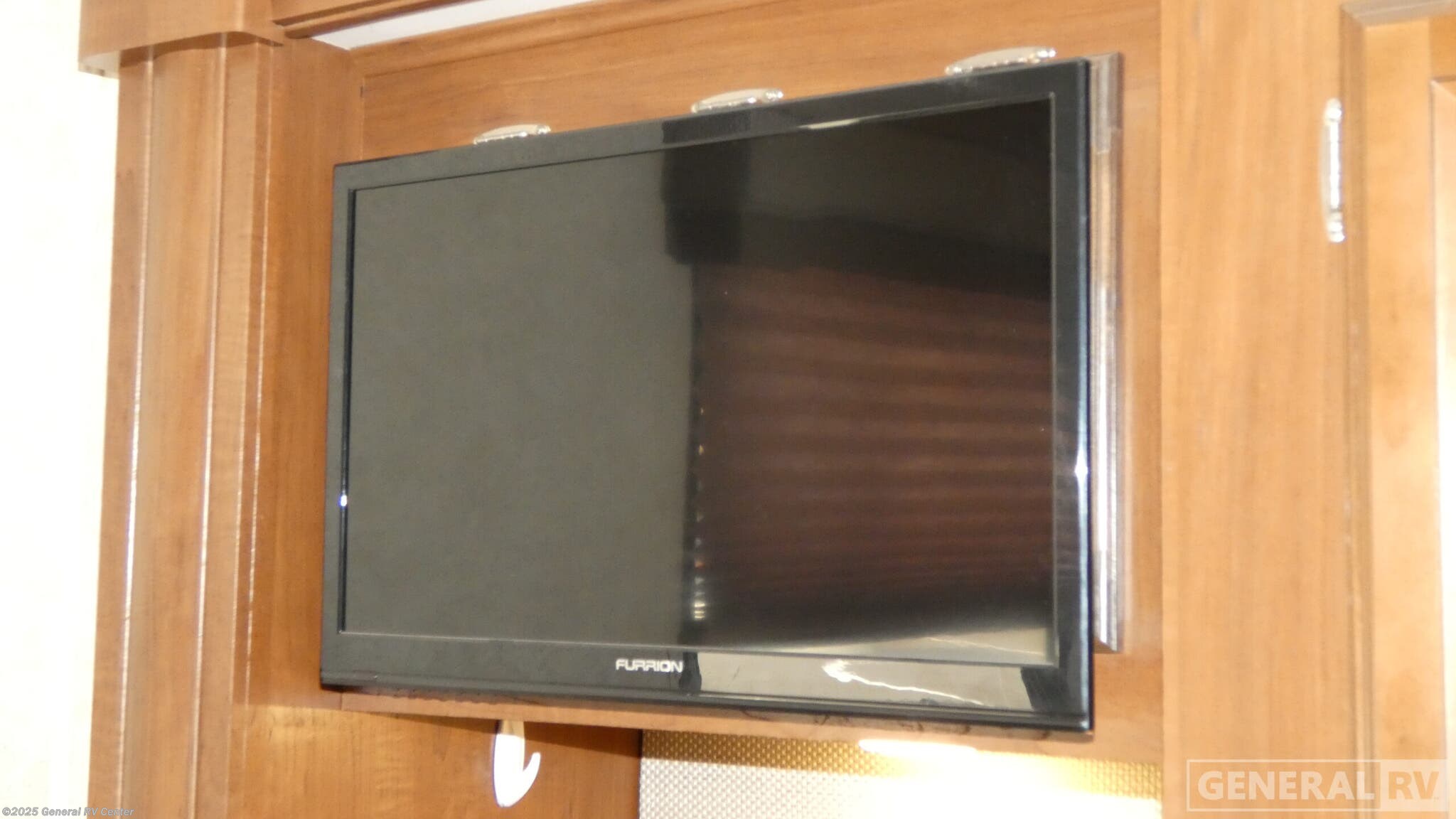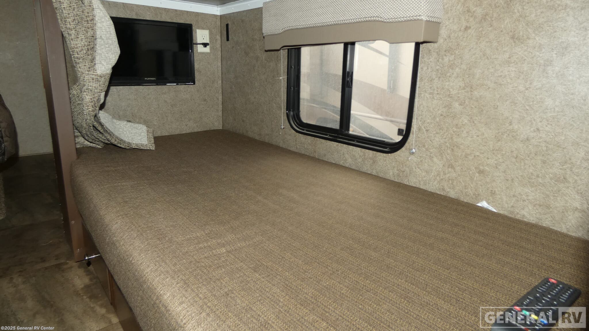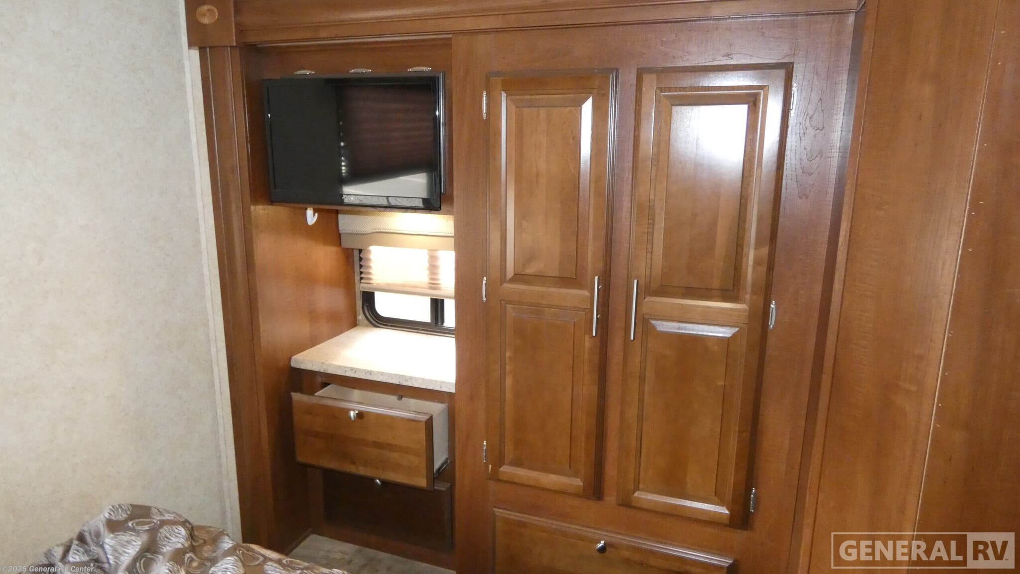 A full wall slide and plenty of comfortable living space is what you will find in the Georgetown 3 Series 31B3 motor home by Forest River. Step inside and find luxury and convenience at your fingertips. To the left of the entrance there is a double kitchen sink, overhead cabinet, and pantry for your dry goods. To the right of the entry door you will find a sofa and an overhead cabinet. The wall slide features a dinette with a TV above, microwave, three burner range, refrigerator, bunks, wardrobe, and TV. In the rear bedroom there is a queen bed, nightstands, and overhead cabinet. Leaving the bedroom you will find the side aisle bathroom with a toilet, sink, and corner shower, plus so much more!