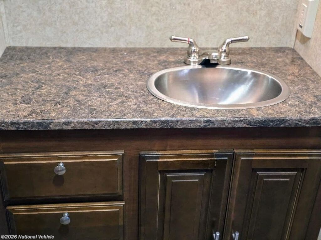 When you step inside the 329DS Georgetown motor home by Forest River you will be in the kitchen and living area. With a slide in the main living area you will appreciate how open and spacious this motor home feels. Coming in the motor home, to the left there is a counter extension, TV, double kitchen sink, three burner range, microwave, a residential refrigerator, and pantry. The opposite side of the motor home has a sofa and u-shaped dinette slide.
