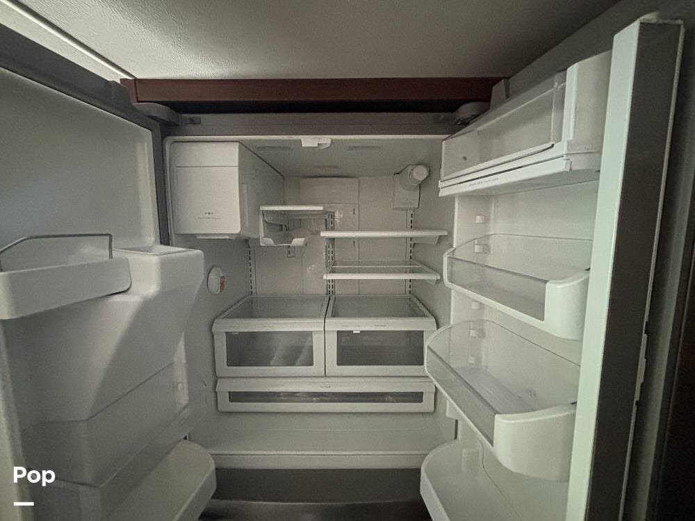 The kitchen is fully equipped to handle mealtime with ease. A solid-surface countertop provides workspace for food prep, while the three-burner cooktop and oven allow for versatile cooking. A microwave is mounted overhead for quick meals, and a refrigerator and freezer are included to keep groceries fresh. Cabinetry above and below the counters offers plenty of storage for cookware and pantry items.