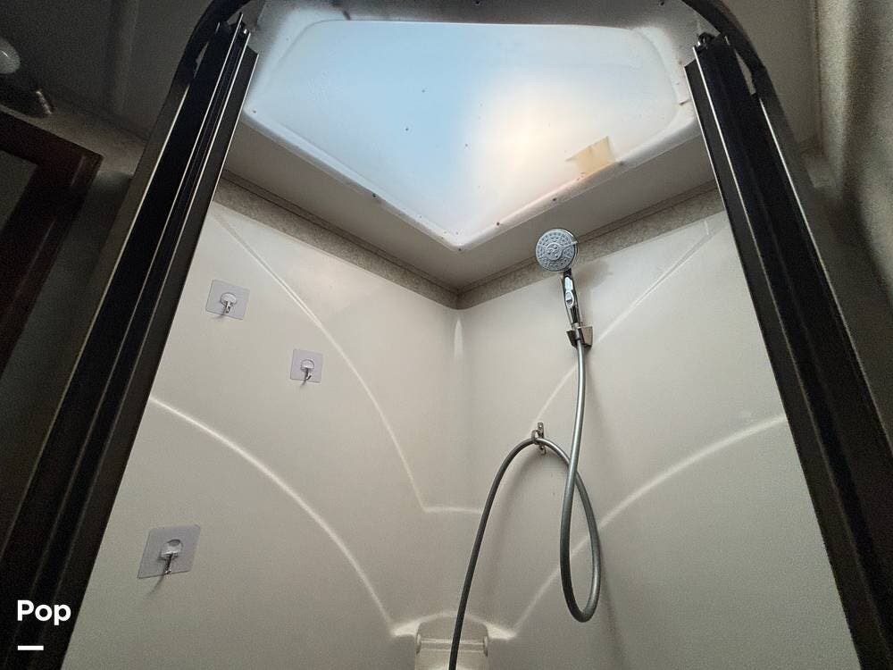The bathroom features a full-sized shower with a glass door and skylight, providing extra headroom and brightness. A vanity with sink and storage below provides space for toiletries, while a medicine cabinet above keeps smaller items organized. The toilet is conveniently positioned for easy access, and there is sufficient room to move comfortably within the bathroom area.