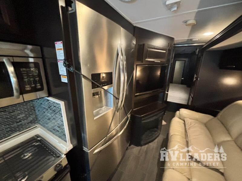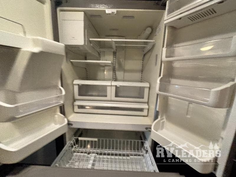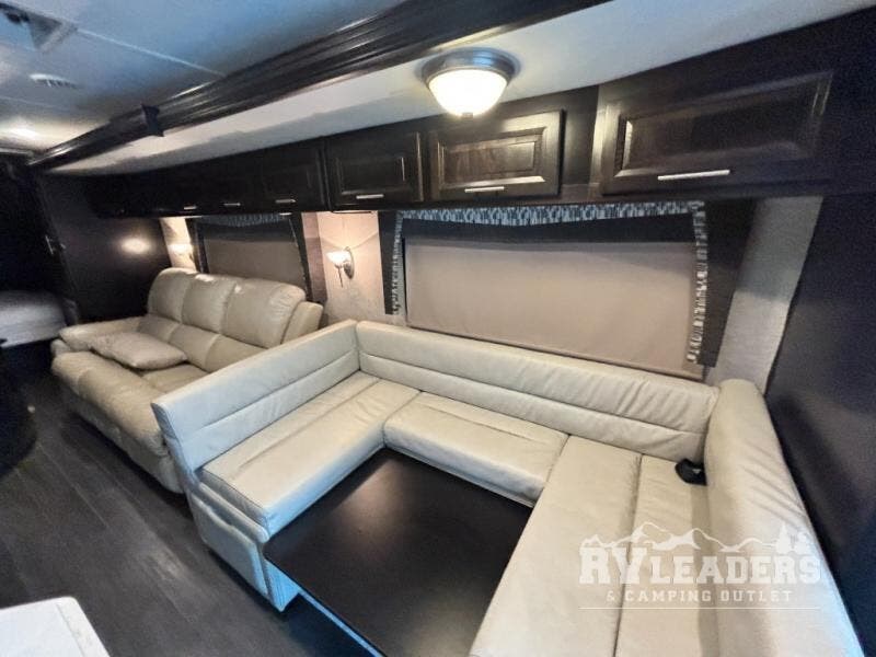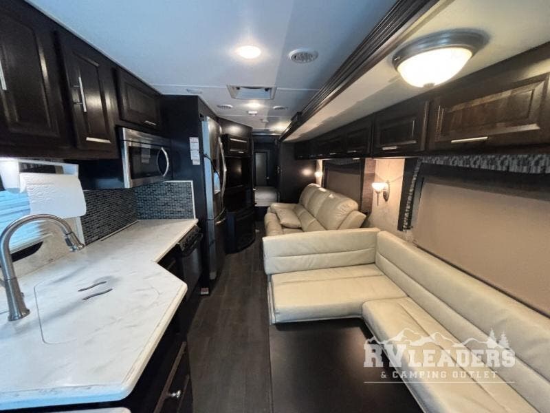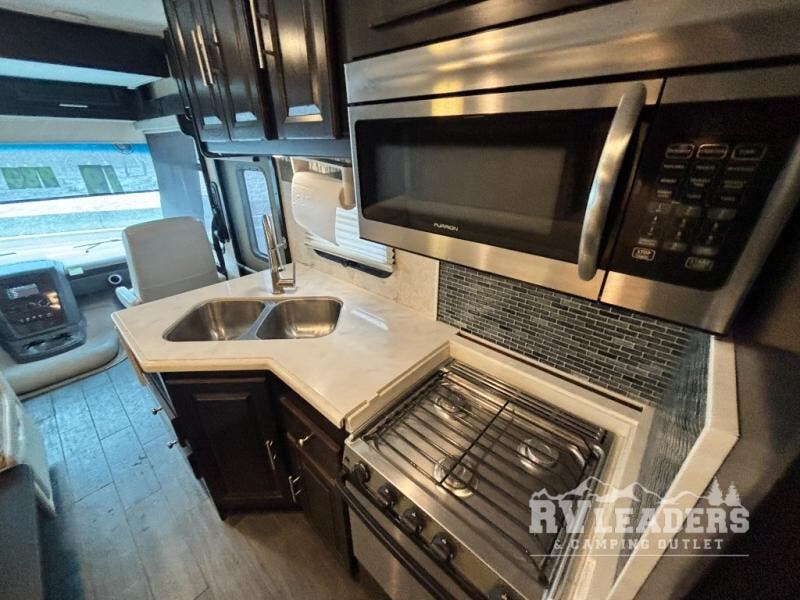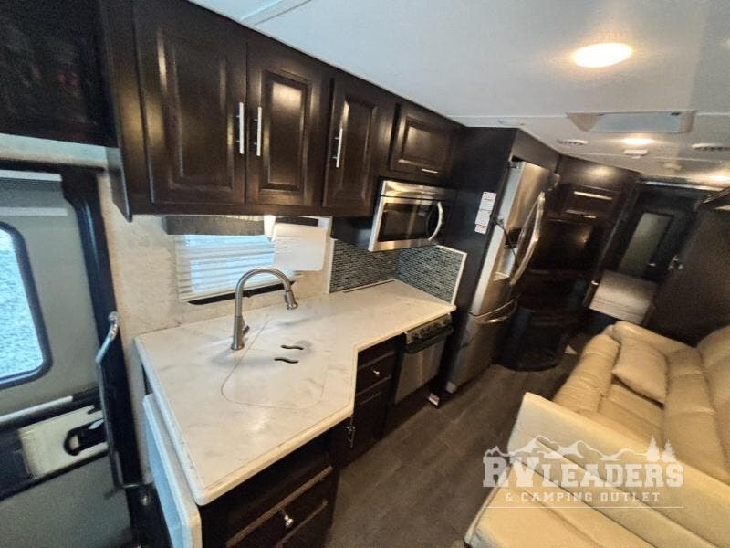 You will be wowed by the space and beauty inside the motor home. In the kitchen/living area there is a slide with a hide-a-bed sofa, dinette, and overhead cabinet. On the opposite side of the motor home you will see a double kitchen sink, overhead TV, three burner range, microwave, refrigerator or you can choose an optional residential refrigerator, and pantry.