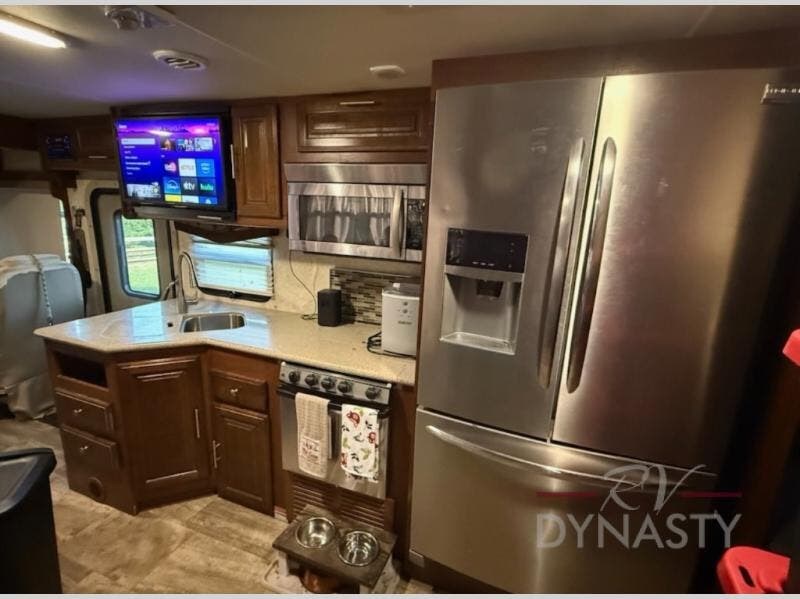 You will be wowed by the space and beauty inside the motor home. In the kitchen/living area there is a slide with a hide-a-bed sofa, dinette, and overhead cabinet. On the opposite side of the motor home you will see a double kitchen sink, overhead TV, three burner range, microwave, refrigerator or you can choose an optional residential refrigerator, and pantry.