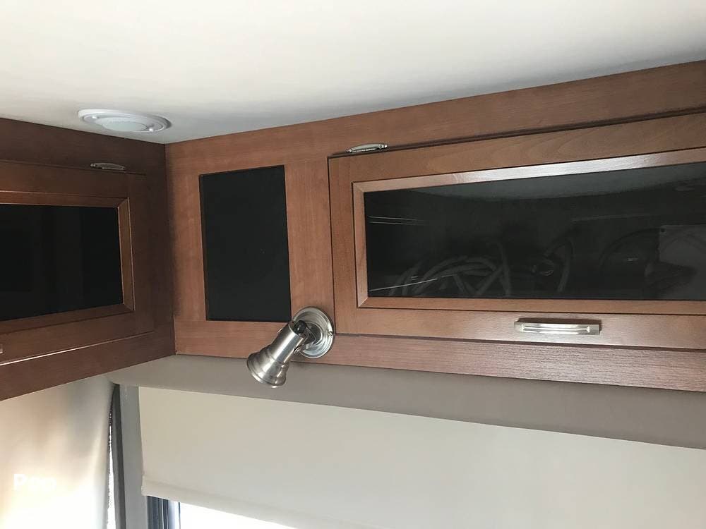 The Primary suite in the rear of the coach features a walk-around custom queen-size bed, accompanied by a TV cabinet, wardrobe, and additional storage space.