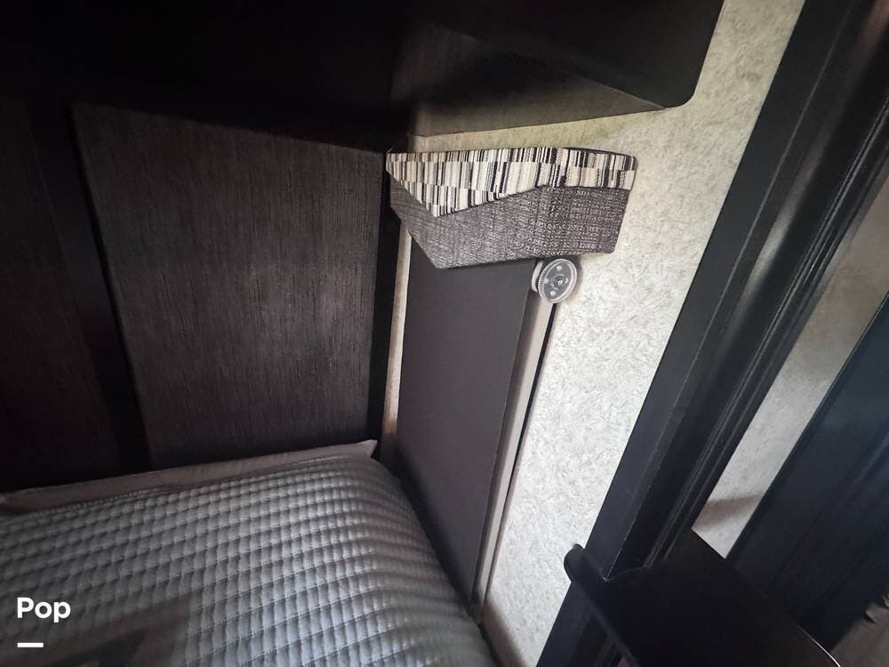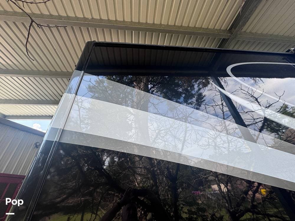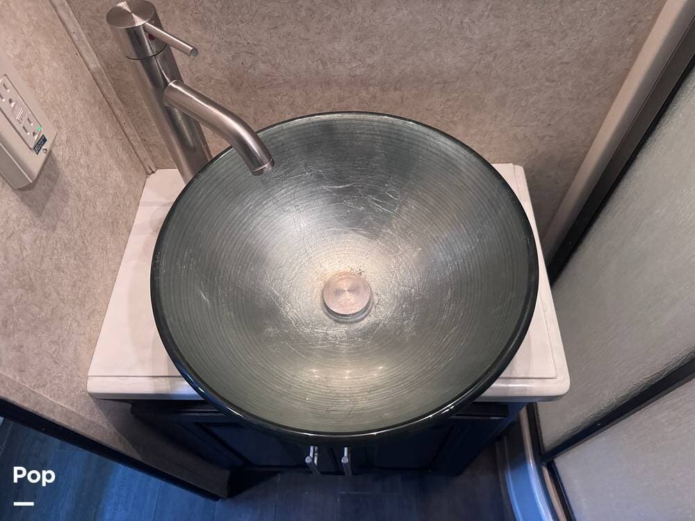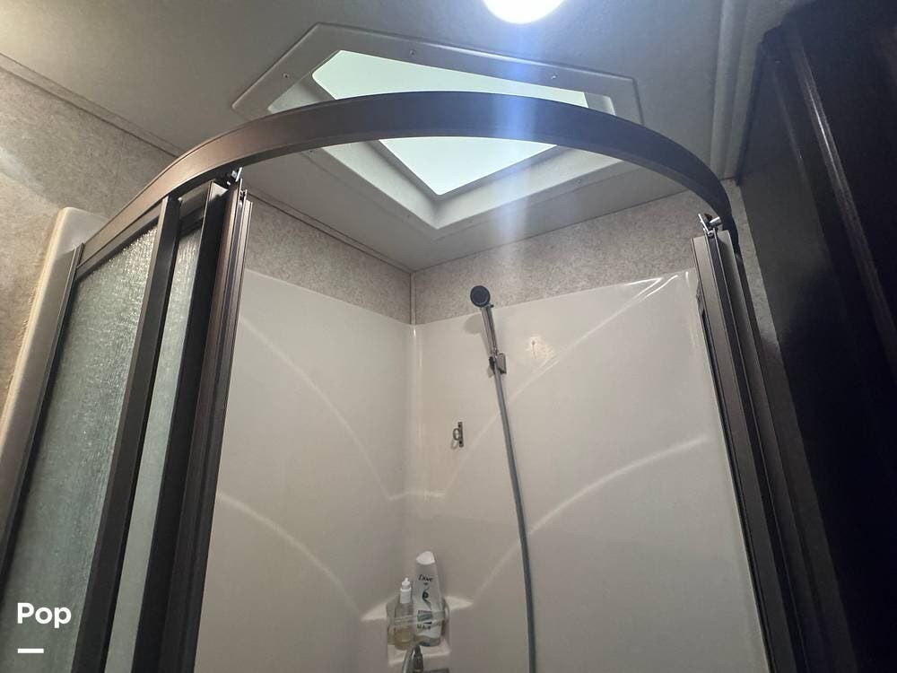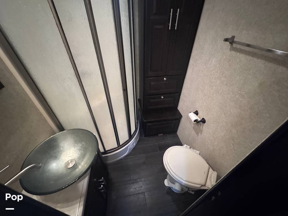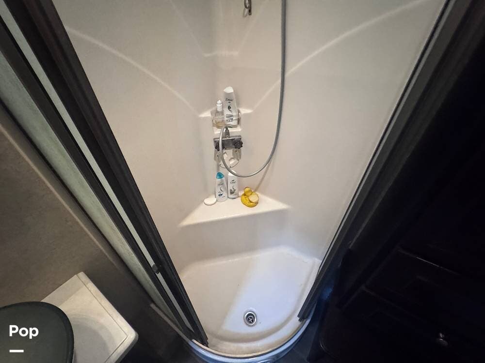 The bathroom includes a spacious shower with glass doors, a solid-surface vanity, and a porcelain toilet. The layout is both functional and stylish, offering the comforts of home on the road.