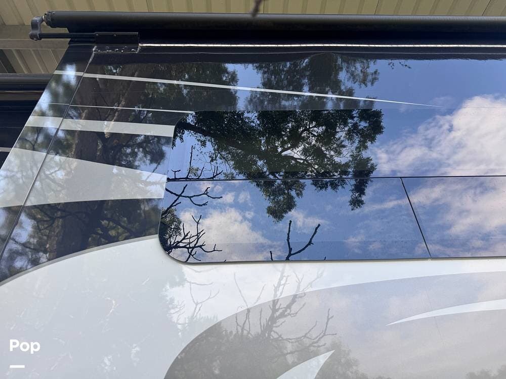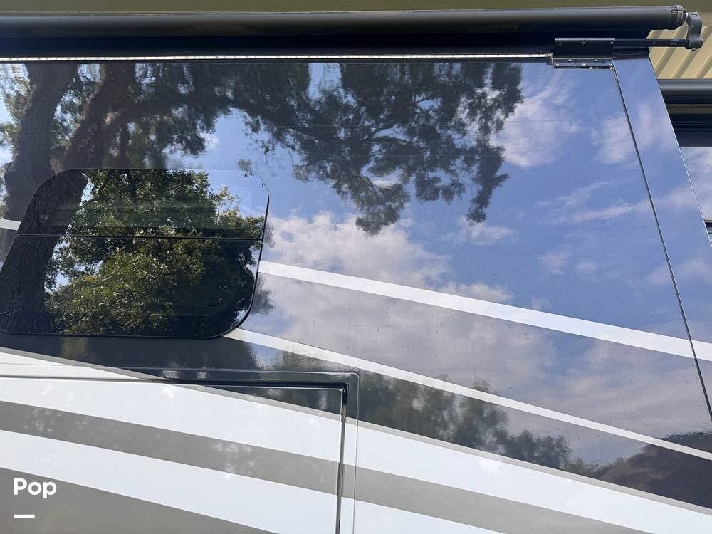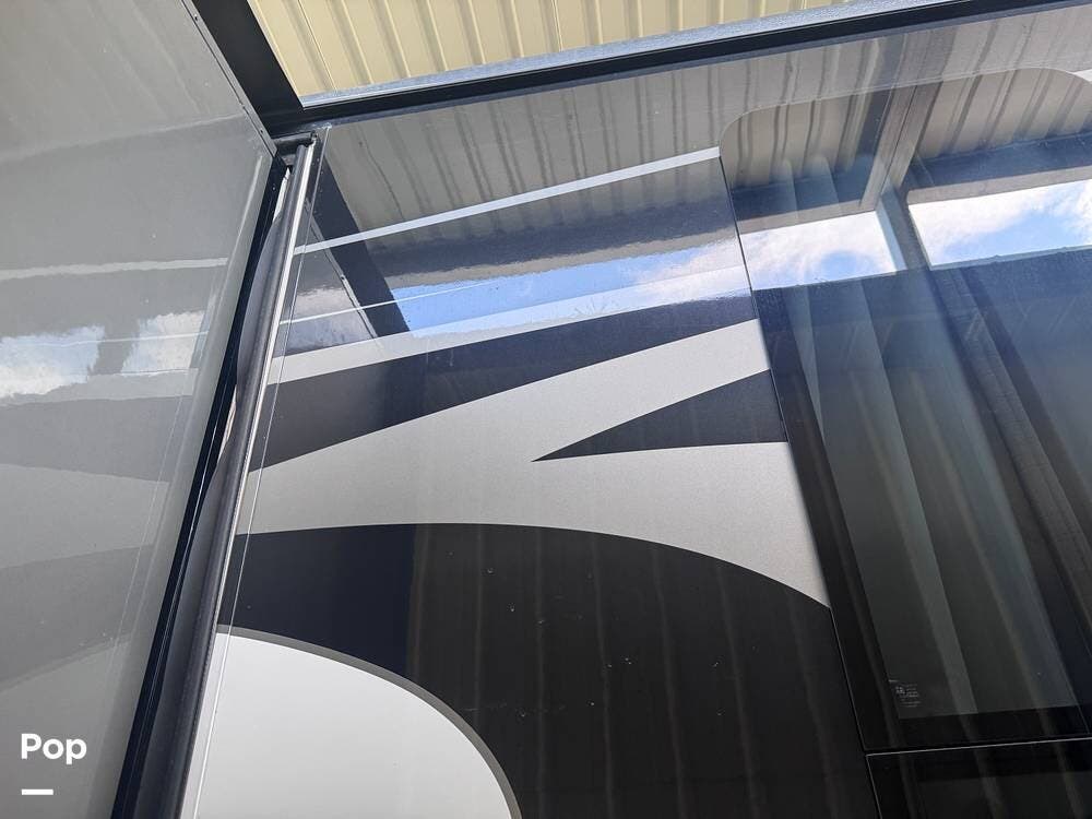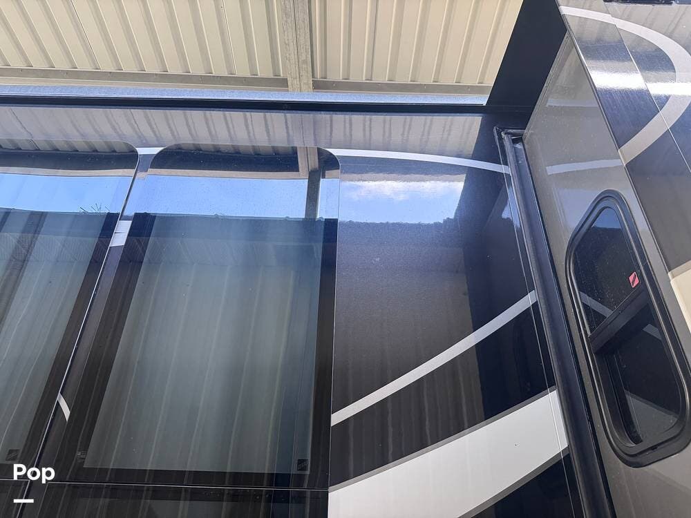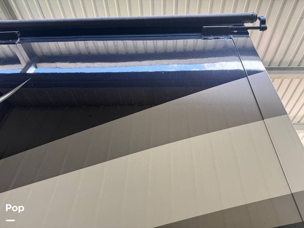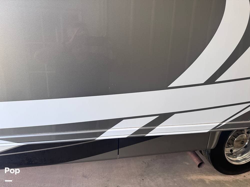 The bathroom includes a spacious shower with glass doors, a solid-surface vanity, and a porcelain toilet. The layout is both functional and stylish, offering the comforts of home on the road.
