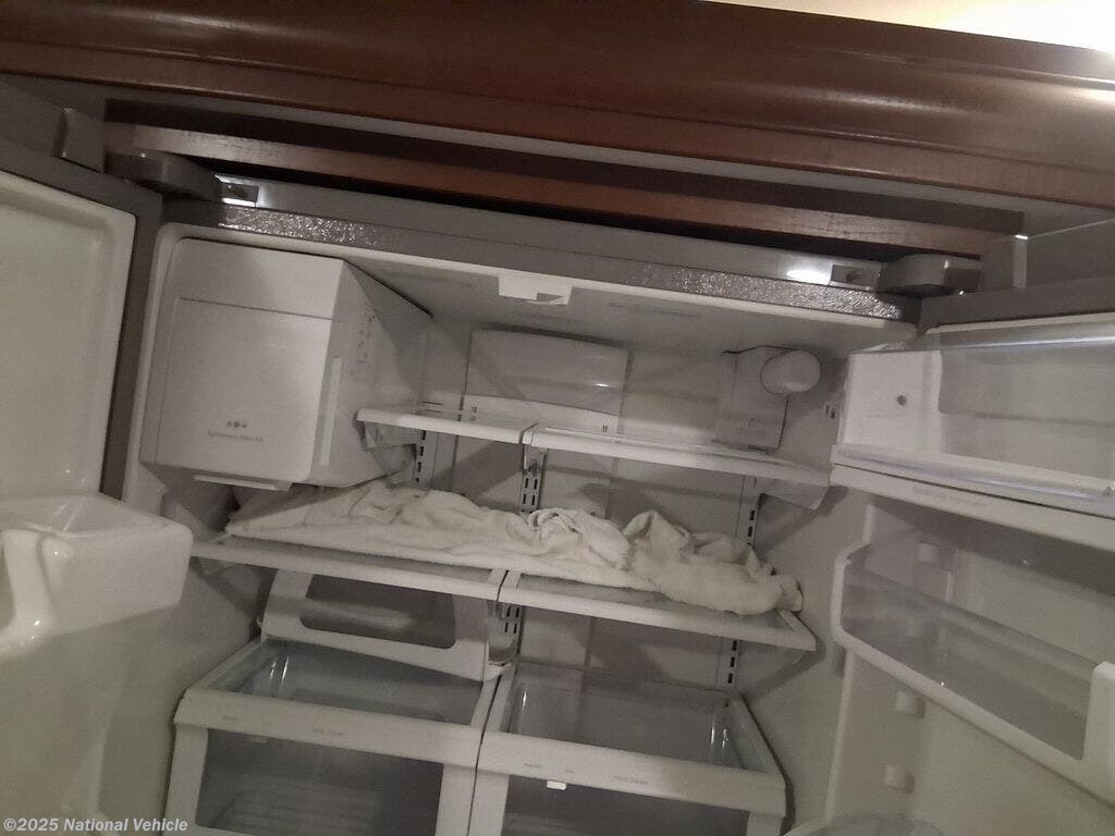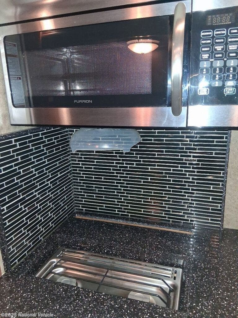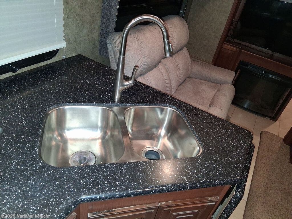 Step inside to a spacious triple-slide layout with high-end craftsmanship. Solid-surface countertops, rich cabinetry, and tile-look flooring create a residential atmosphere. The large living area offers theater-style recliners and a cozy entertainment center. A generous kitchen features stainless appliances, abundant storage, and a residential refrigerator.