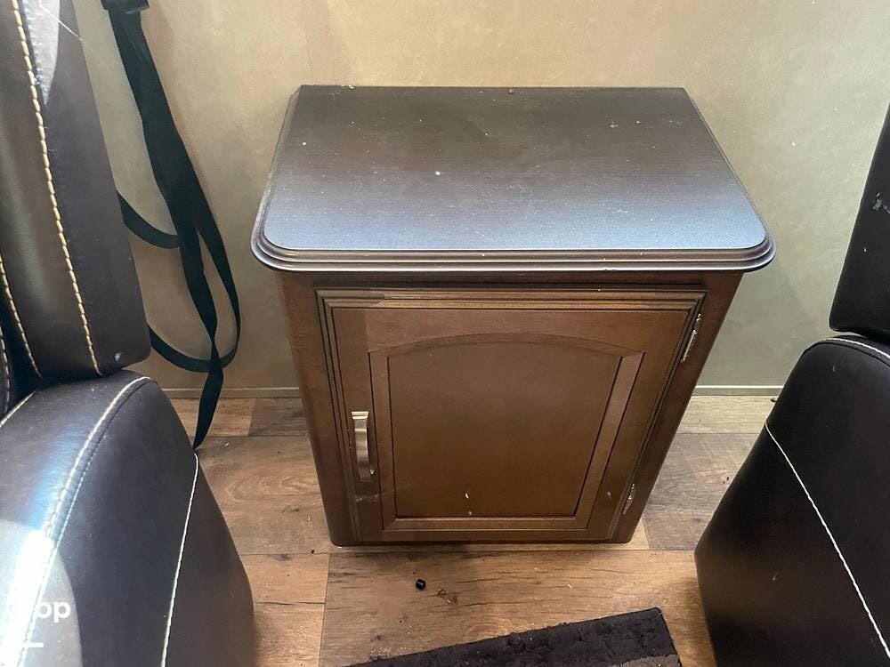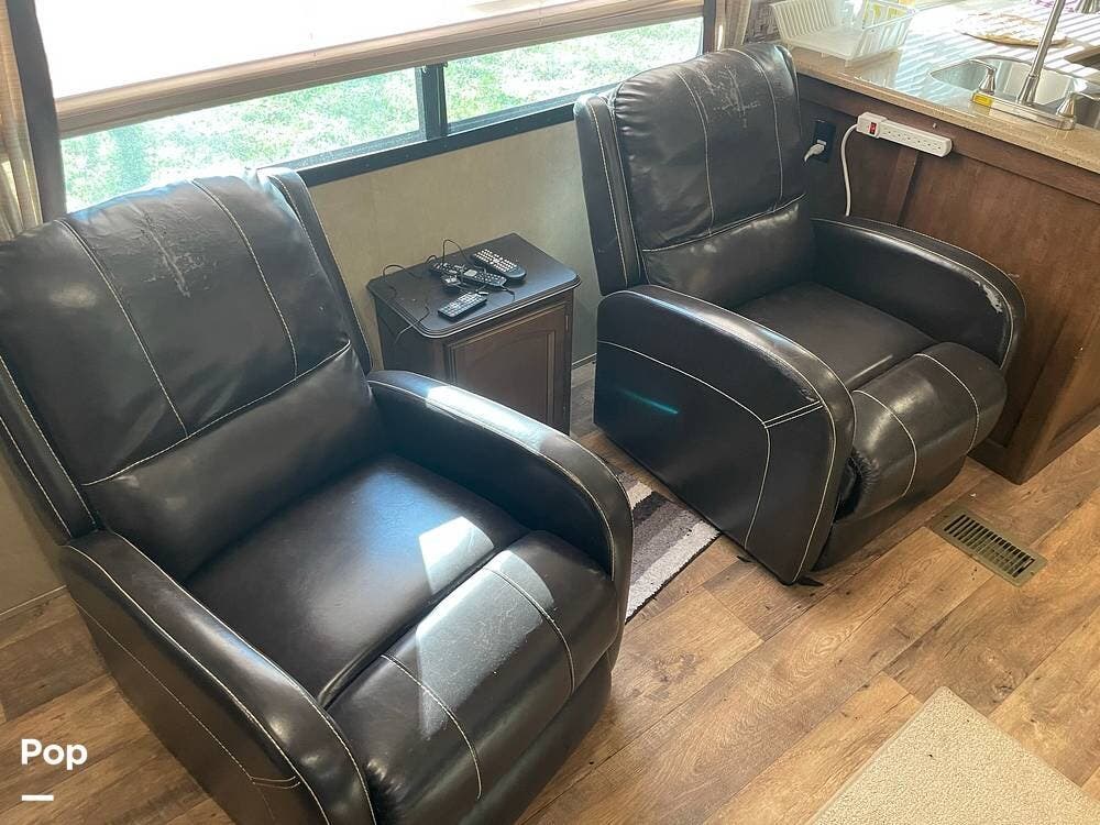 Currently the living area has two stand alone recliners and the opposite slide has a desk and space for a dining table and chairs. To the rear of the trailer is the wrap around kitchen with plenty of space to easily prepare meals and storage for everything you need!