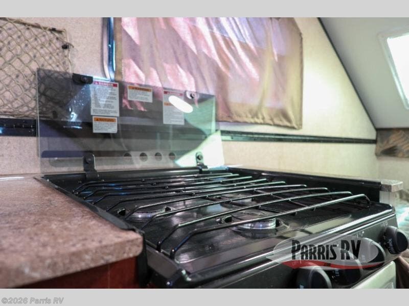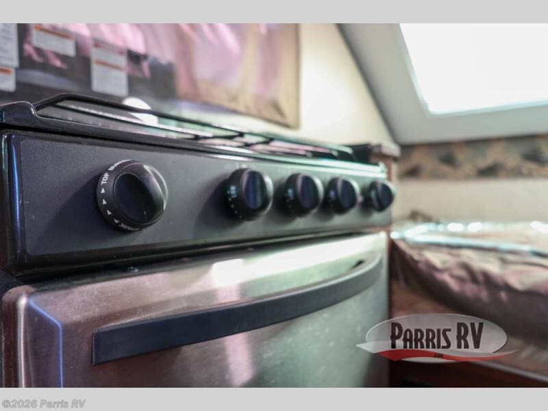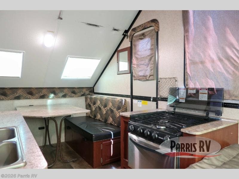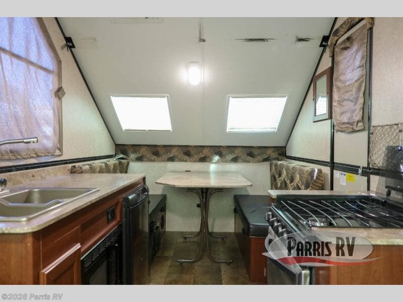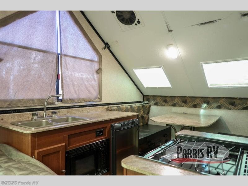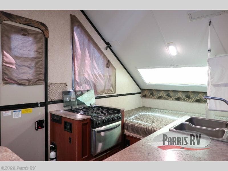 As you enter the A212HW Rockwood Hard Side folding pop-up camper by Forest River, you will find that there is a 50" x 80" front dinette. Along one side of the camper there is a XL refrigerator, double kitchen sink, and microwave. Across from the sink you will find a three burner range and oven. Along the rear of the camper you can enjoy a good night's rest on the 60" x 80" flip-up bed.