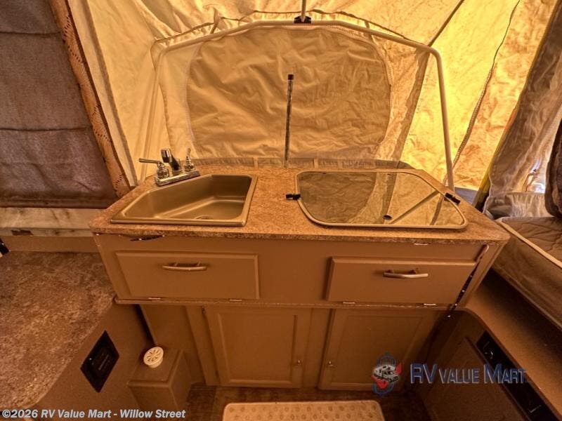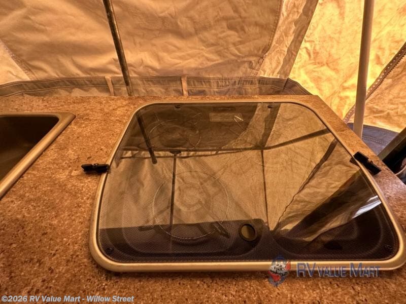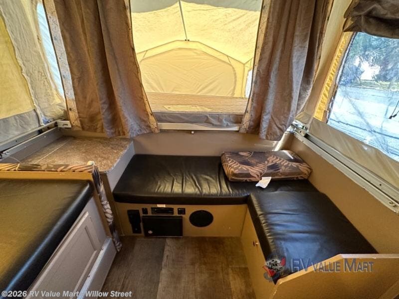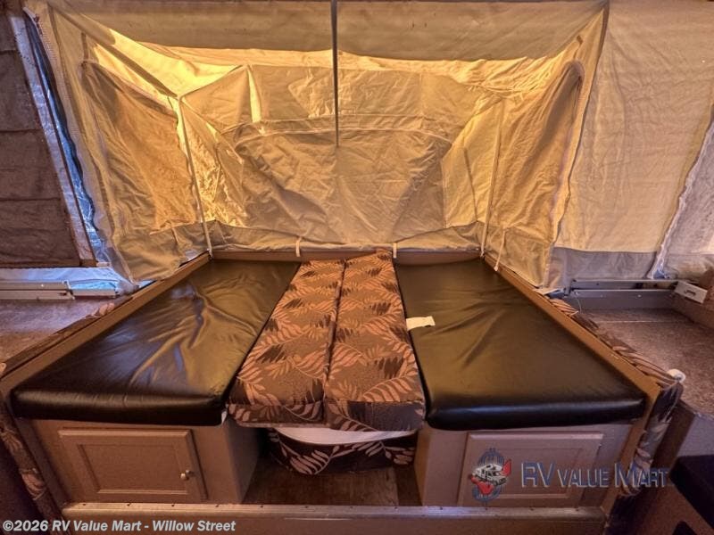 As you continue around, a slide out has a booth dinette. Back inside the pop-up camper is a cabinet with an optional refrigerator below.