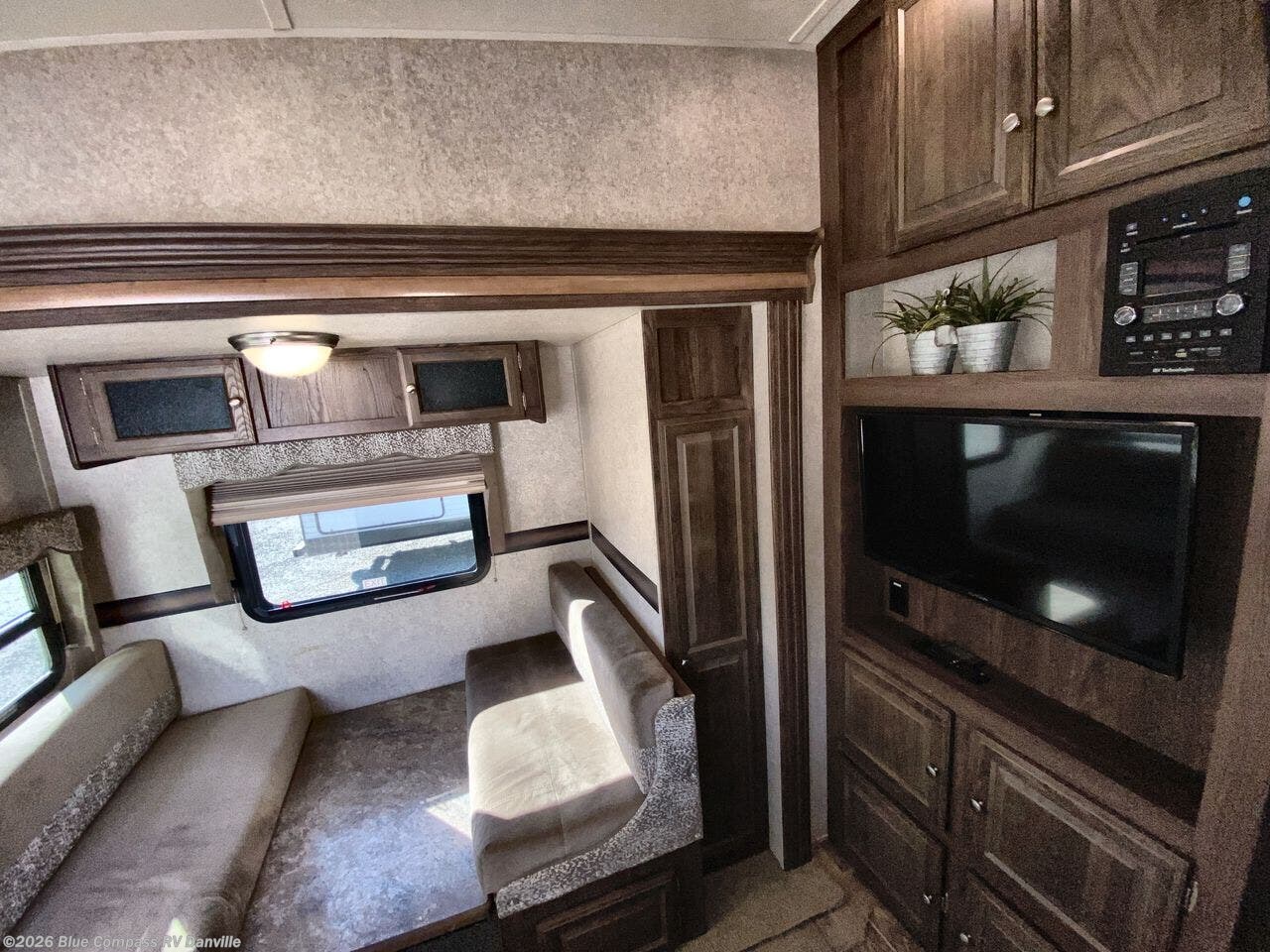 On the opposite side is a slide out booth dinette with a pantry, or you can choose a free standing table with chairs and a pantry instead. An entertainment center is on the interior wall for easy viewing from any seating area.