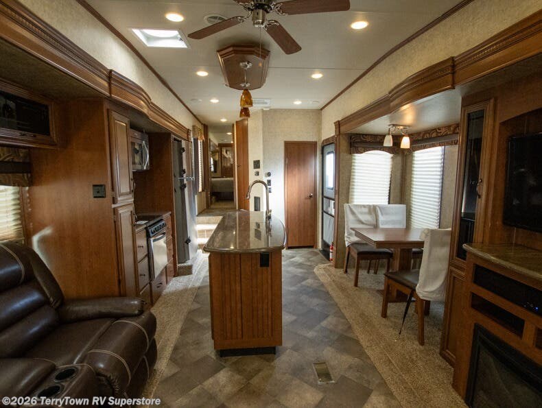 Stepping inside the fifth wheel, to the right, is a walk-in closet. To the left is a slide with a free standing dinette, entertainment center, and fireplace. In the rear, you will find a tri-fold hide-a-bed sofa. The other slide offers two recliners, a pantry, three burner range, microwave, and refrigerator. The kitchen island offers a double kitchen sink, lots of counter space, and a flip-up counter.