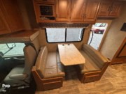 Moving into the main cabin, the passenger side features a slide-out that houses a sofa and dinette across from the galley on the driver's side.