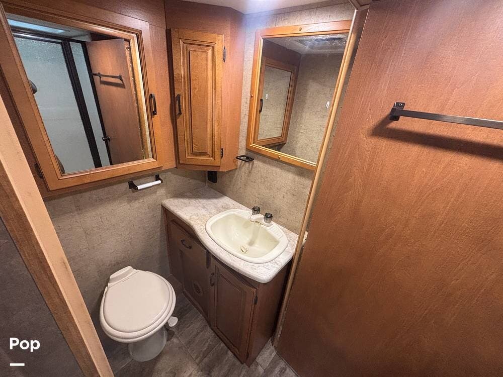 Just behind, a split bathroom places the toilet and sink on one side and a roomy shower on the other.