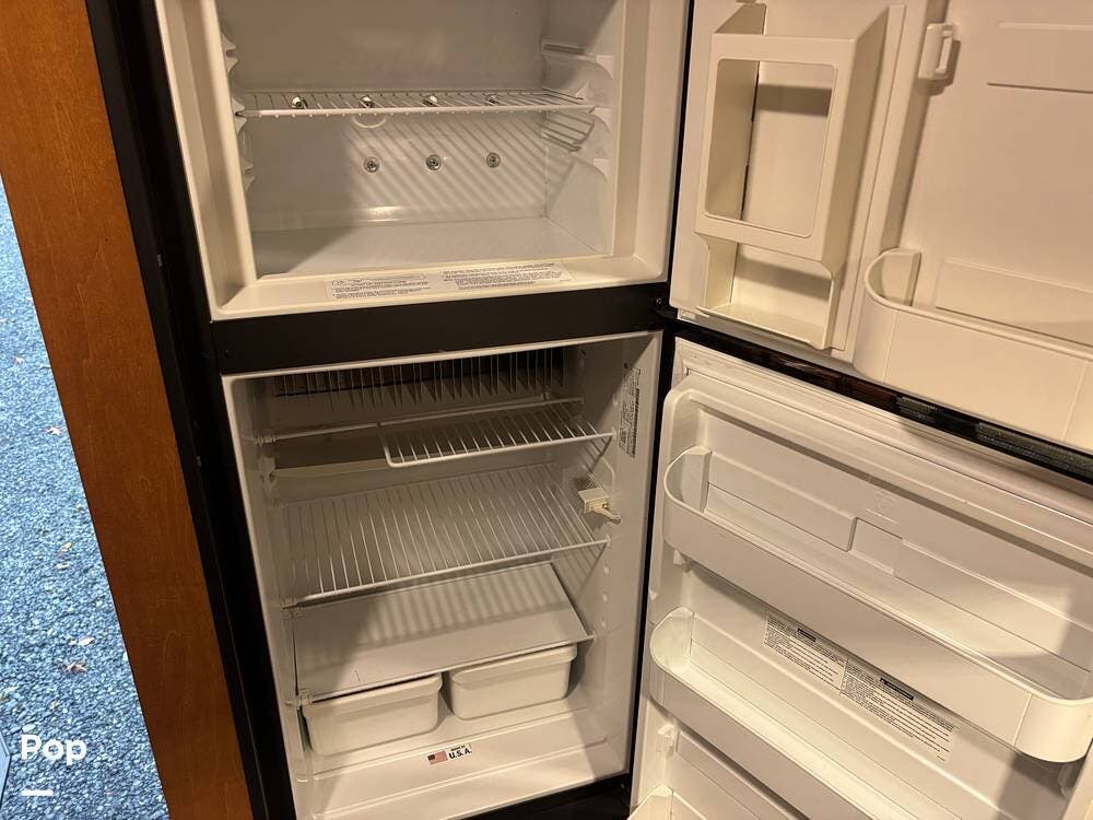 The galley includes a three-burner range, convection microwave, double-door refrigerator, pantry storage, and a flip-up countertop extension.