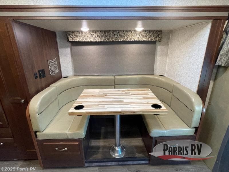 Step inside model 2400W and notice how open it feels with the entire road side extended out. Starting with a u-shaped dinette and two sets of seat belts to keep everyone safe while traveling. There are even cup holders in the table which is great for keeping your drinks safe while moving.