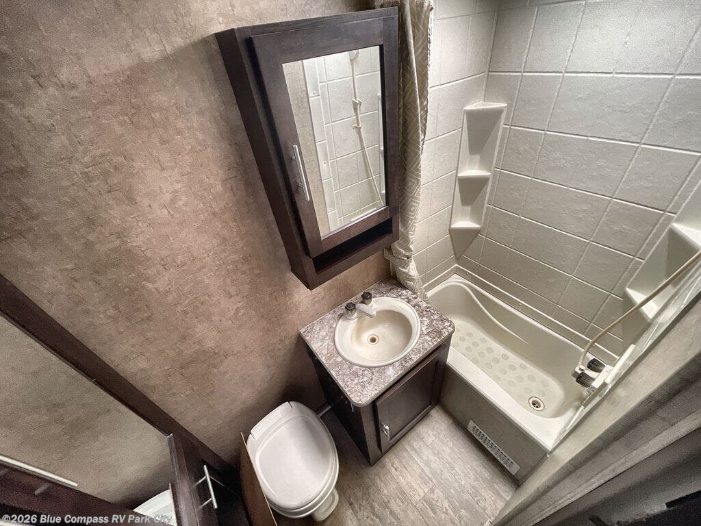 In the rear of the travel trailer you will find the bathroom. The bathroom has a tub/shower, toilet, sink, and bath closet.