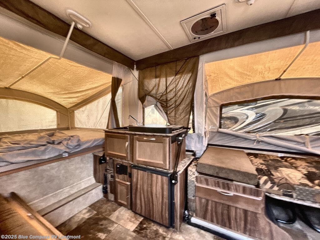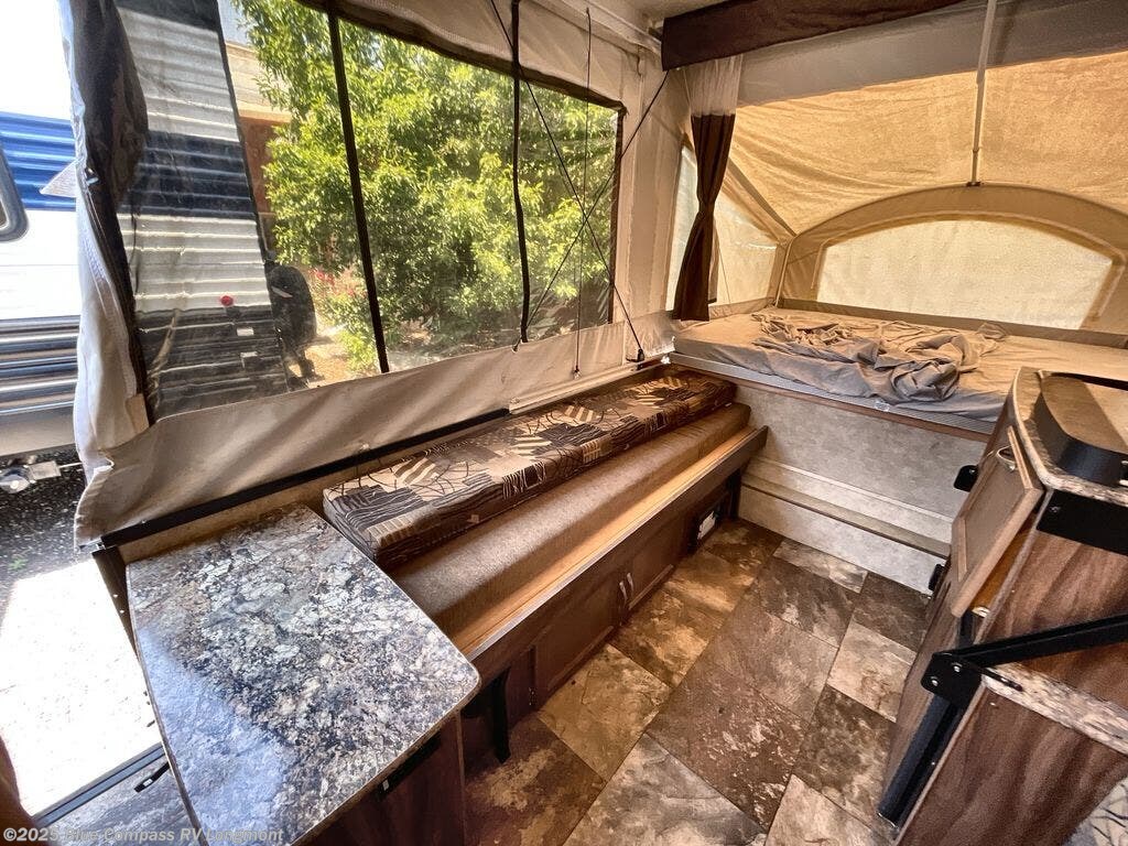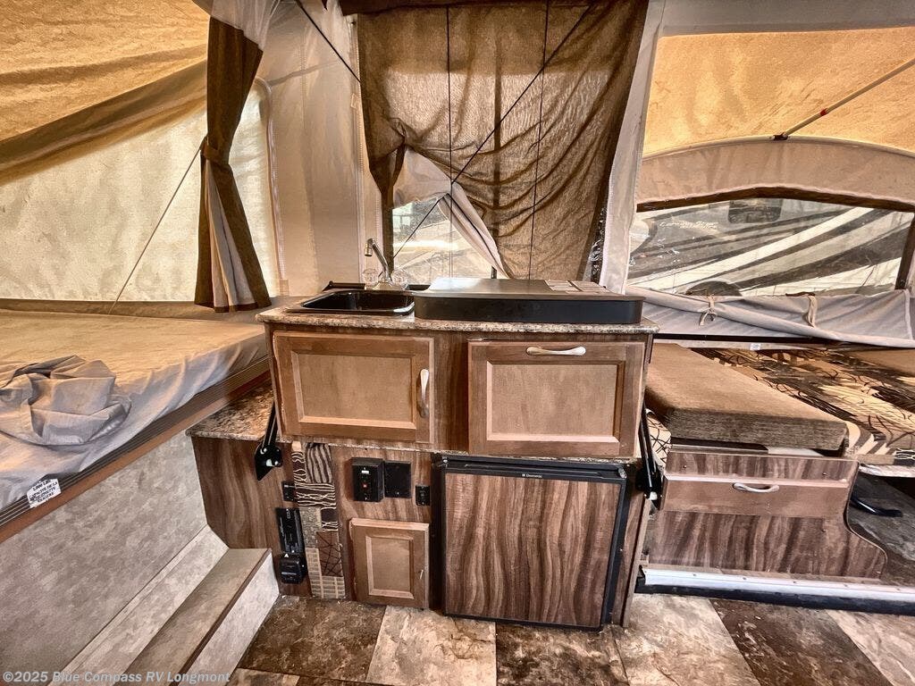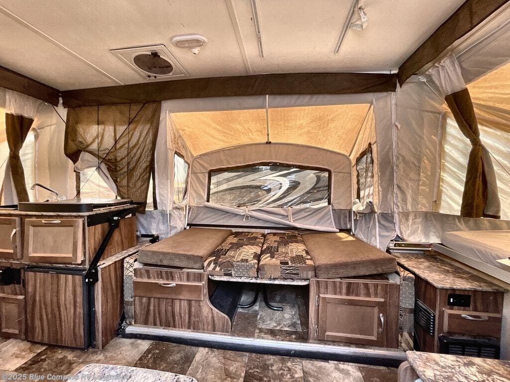 On the inside of this pop-up camper you will enjoy plenty of space with a slide out dinette and table that can be used inside or outdoors. There is lounge seating as well as plenty of storage in the provided cabinets, plus more storage under the dinette bench seats.