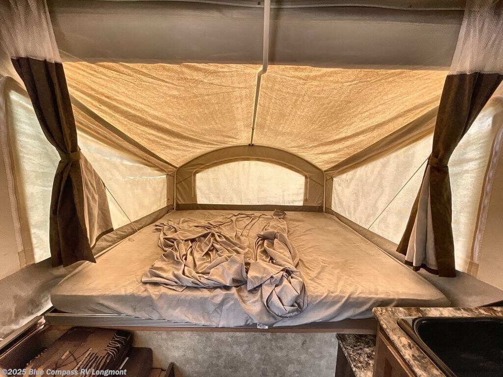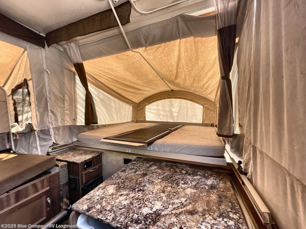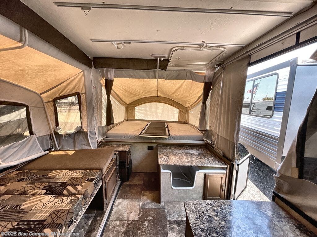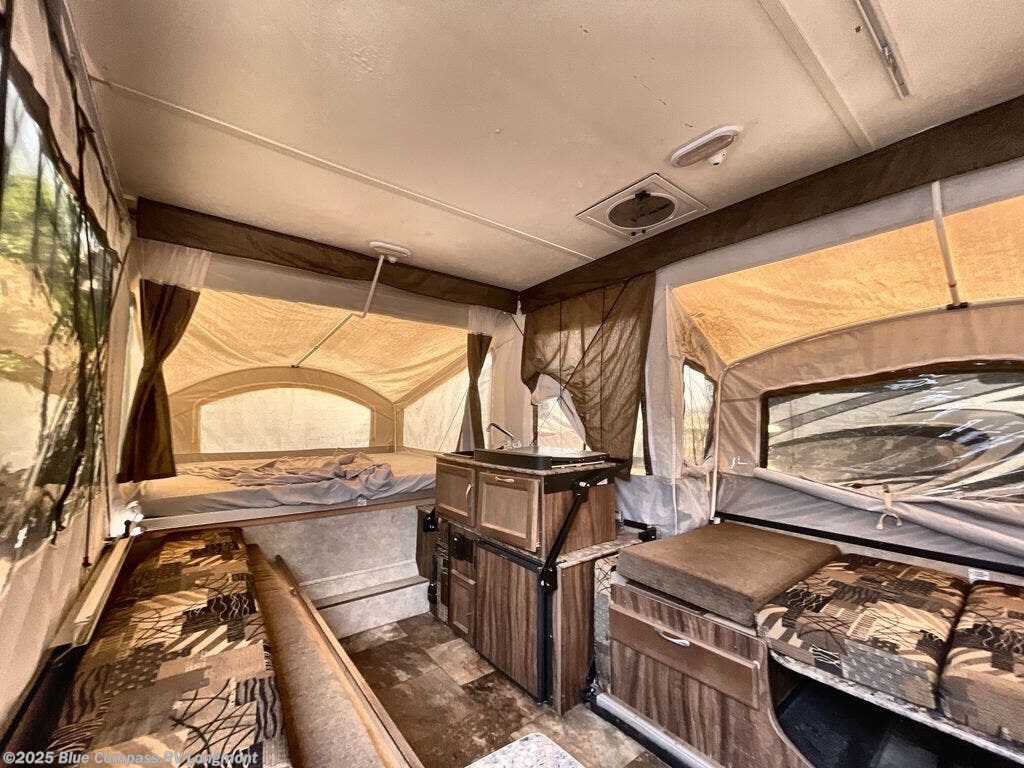 On the inside of this pop-up camper you will enjoy plenty of space with a slide out dinette and table that can be used inside or outdoors. There is lounge seating as well as plenty of storage in the provided cabinets, plus more storage under the dinette bench seats.