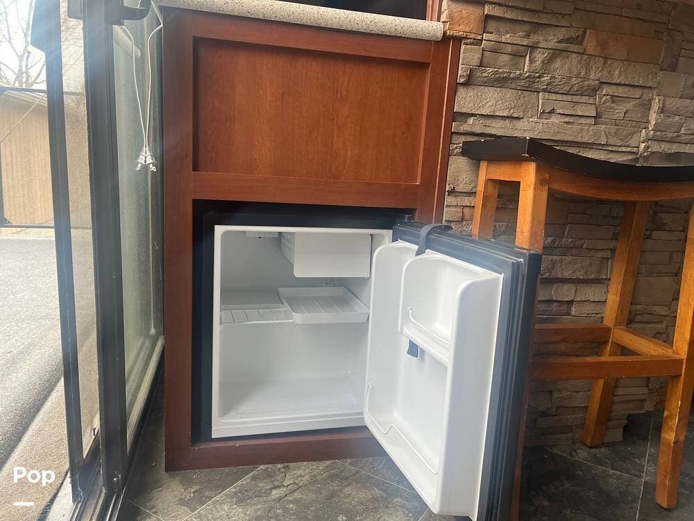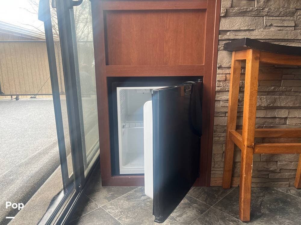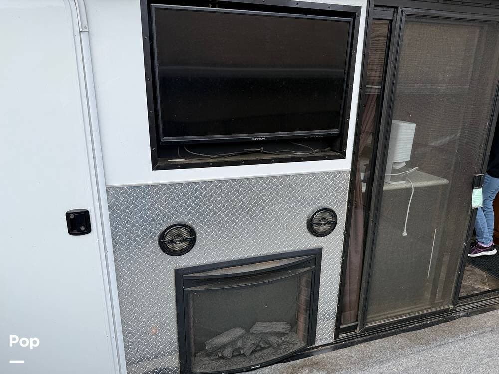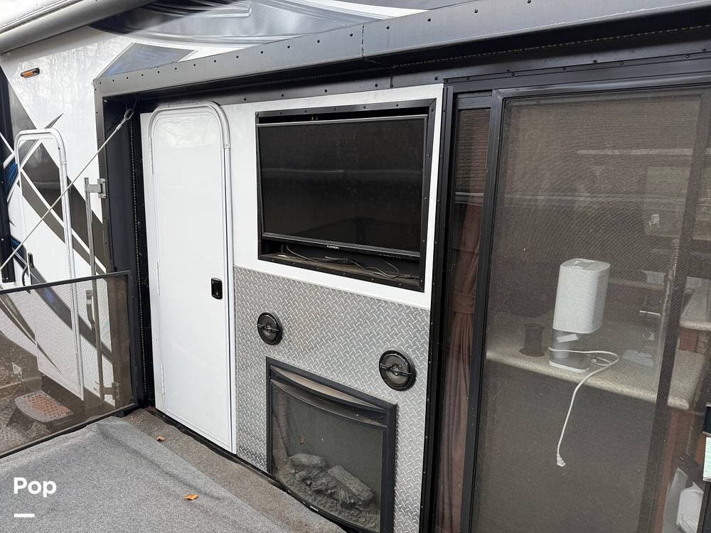Moving forward, the main living area includes theater seating across from an entertainment center with a TV and a fireplace, a patio door leading to the side deck, and a well-equipped kitchen with a refrigerator, a pantry, a microwave, and ample counter space.