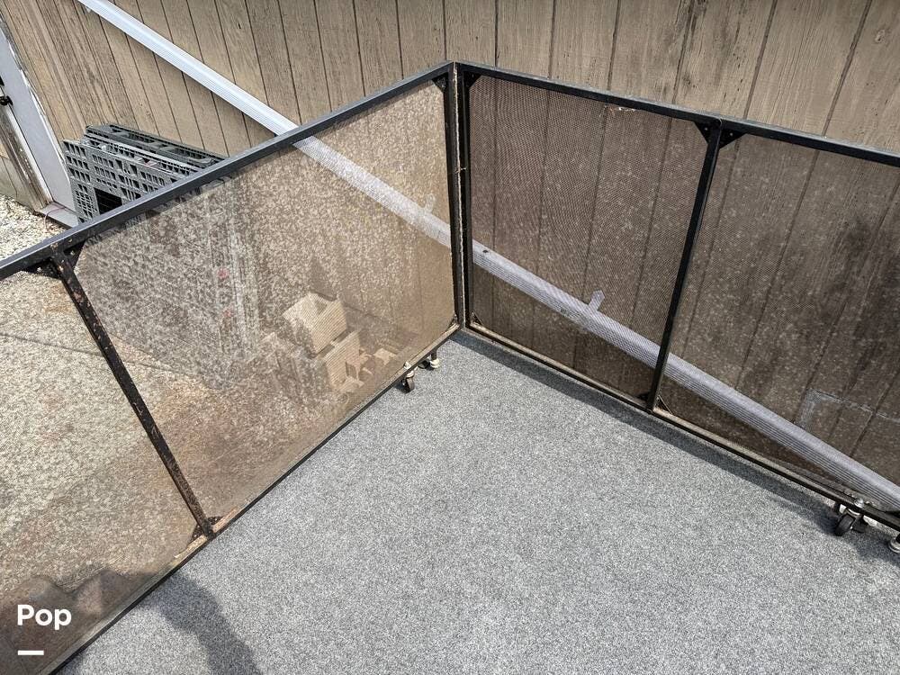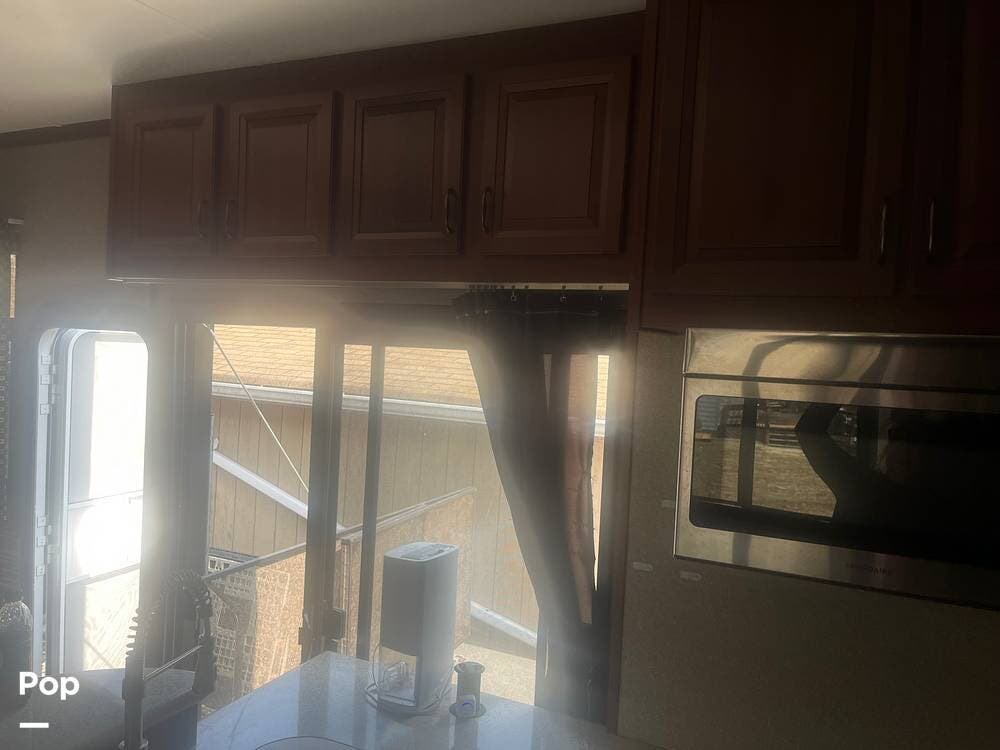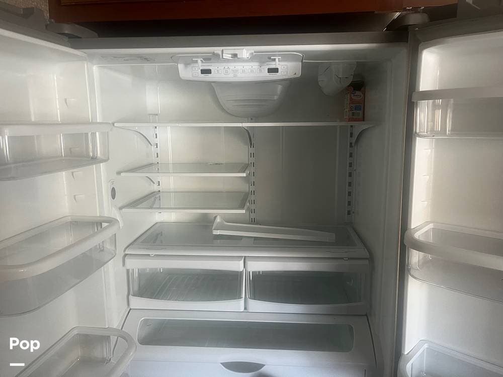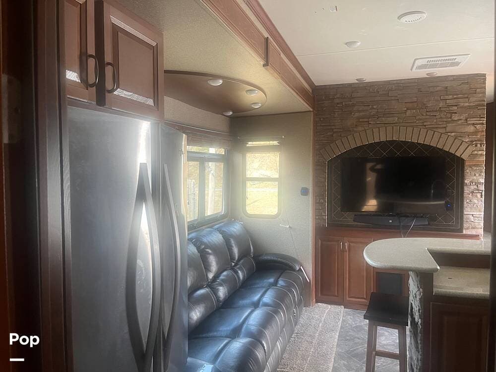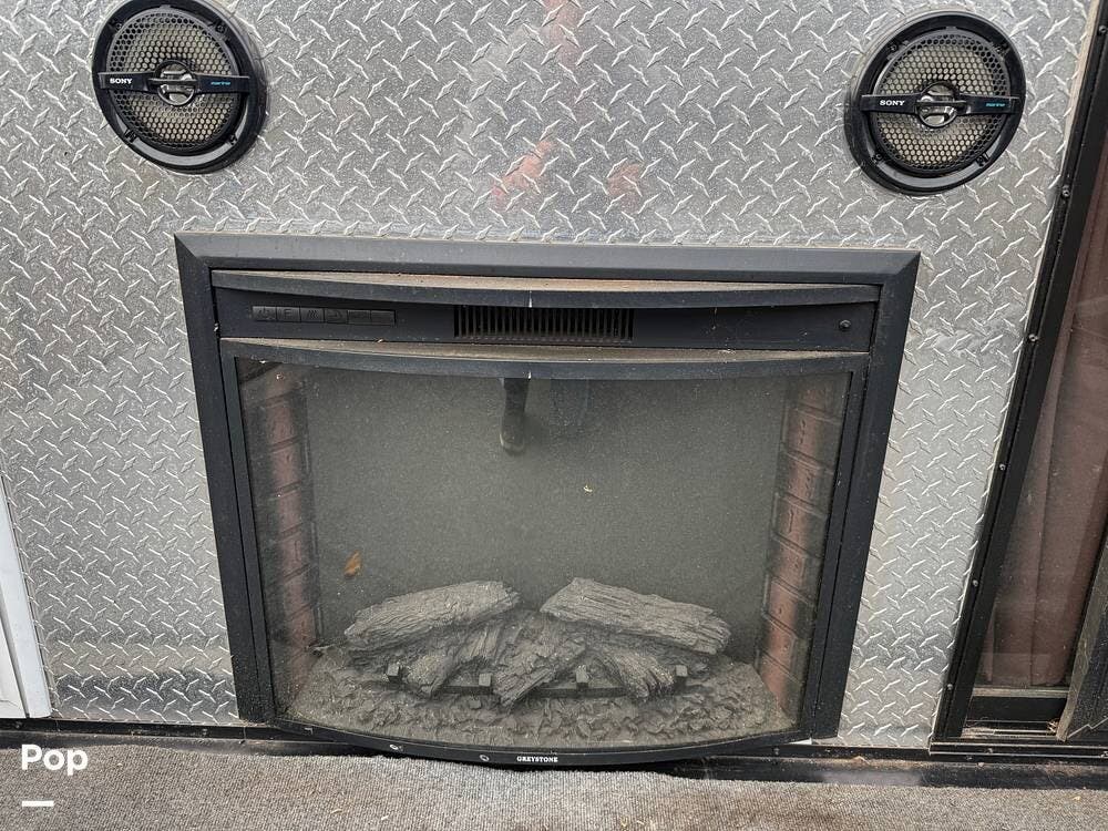 Moving forward, the main living area includes theater seating across from an entertainment center with a TV and a fireplace, a patio door leading to the side deck, and a well-equipped kitchen with a refrigerator, a pantry, a microwave, and ample counter space.