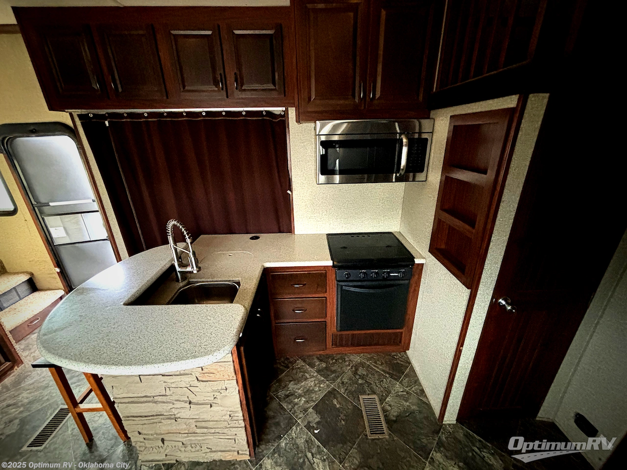 Along the curb side to the left of the entry door enjoy a counter area with two bar stools, a double sink, and a three burner range with overhead microwave oven. You will also find plenty of storage space for dishes and things.