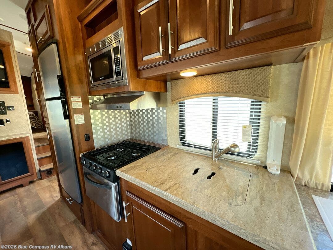 In the kitchen/living area find dual opposing slides. The first slide, next to the door has a three burner range, refrigerator, and 50" LED HDTV. The slide opposite features theater seating with cup holders, and enjoy your meals around the booth dinette. There is drawer storage under the seats of the dinette, or you can choose to add an optional free-standing table with chairs. Adjacent to the slide out you will find a closet, pantry, and switch cab. In the center of the kitchen there is an island with a double kitchen sink, and along the rear wall find more seating at the hide-a-bed sofa, end tables, and overhead cabinet.