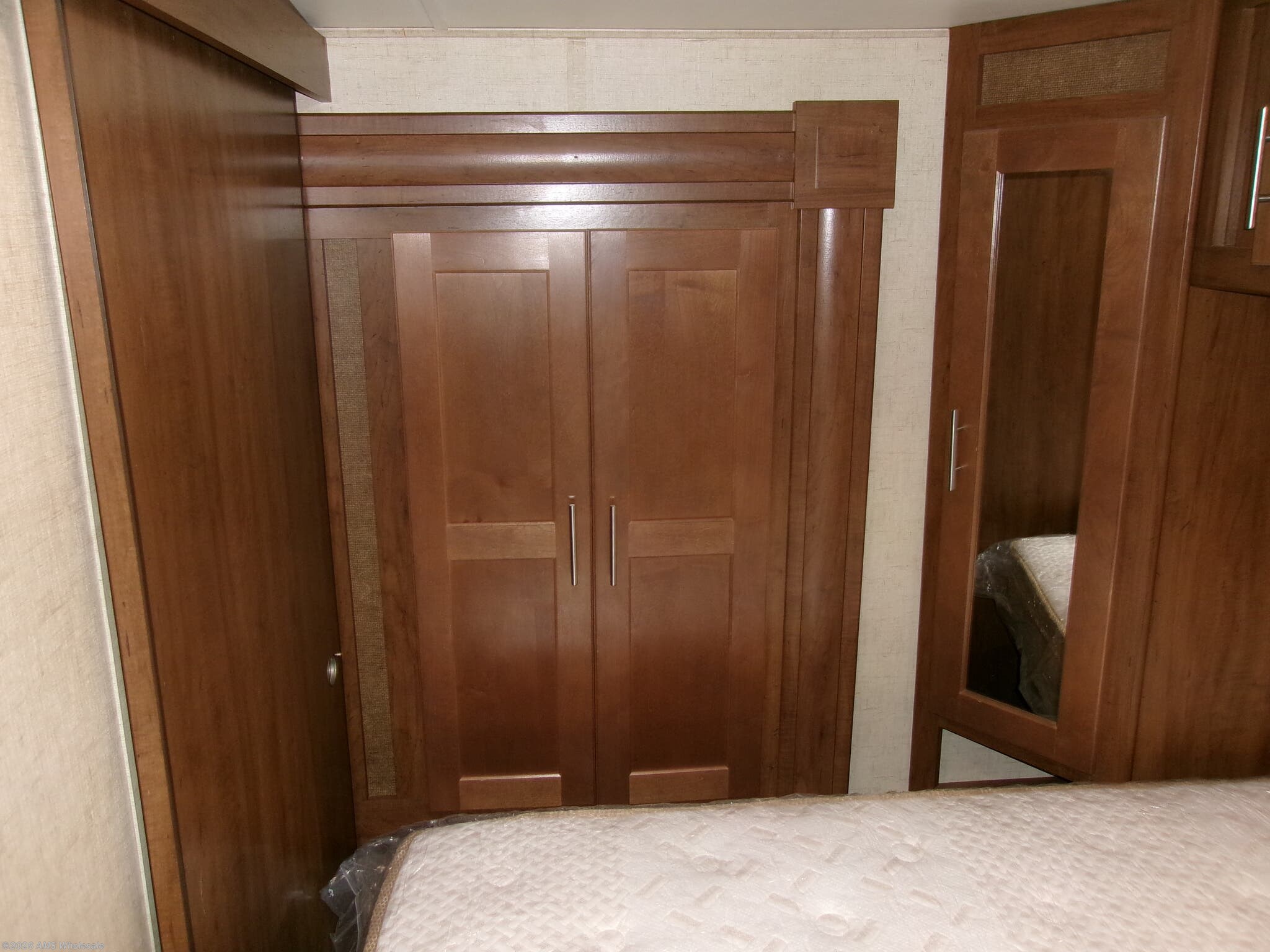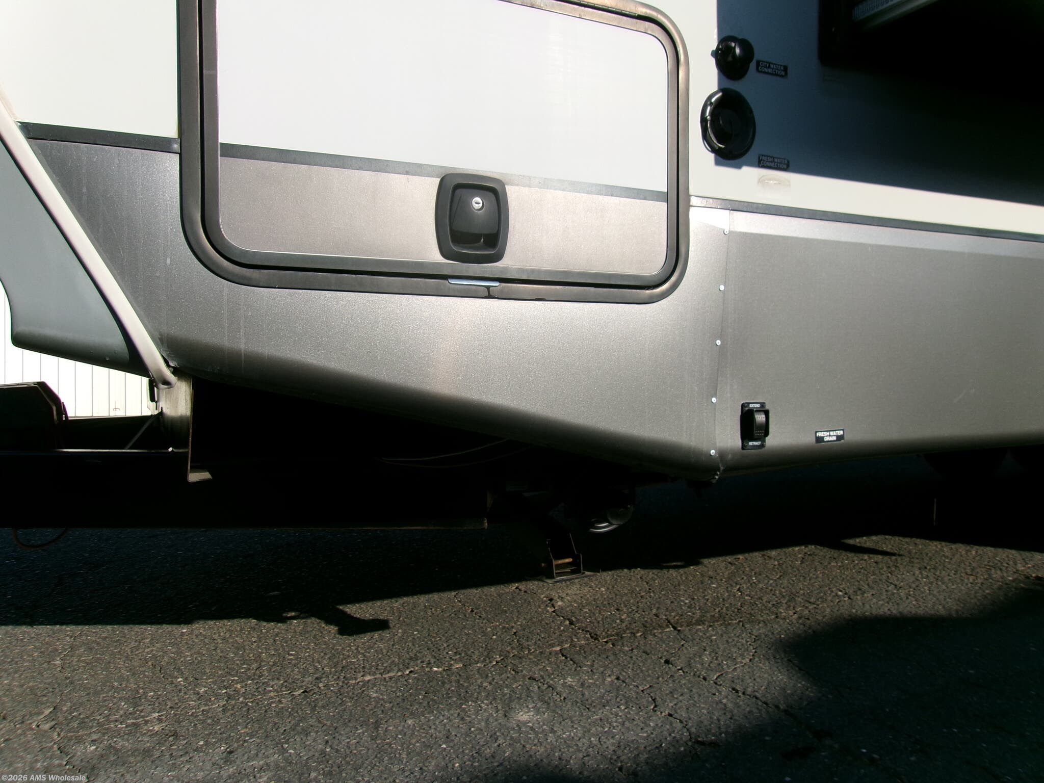 Exterior: Power awning with LED lights, power tongue jack, slam latch baggage doors, and a rear folding rack.