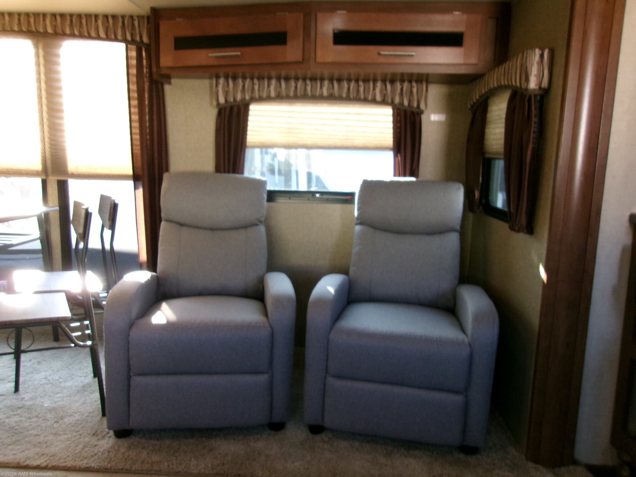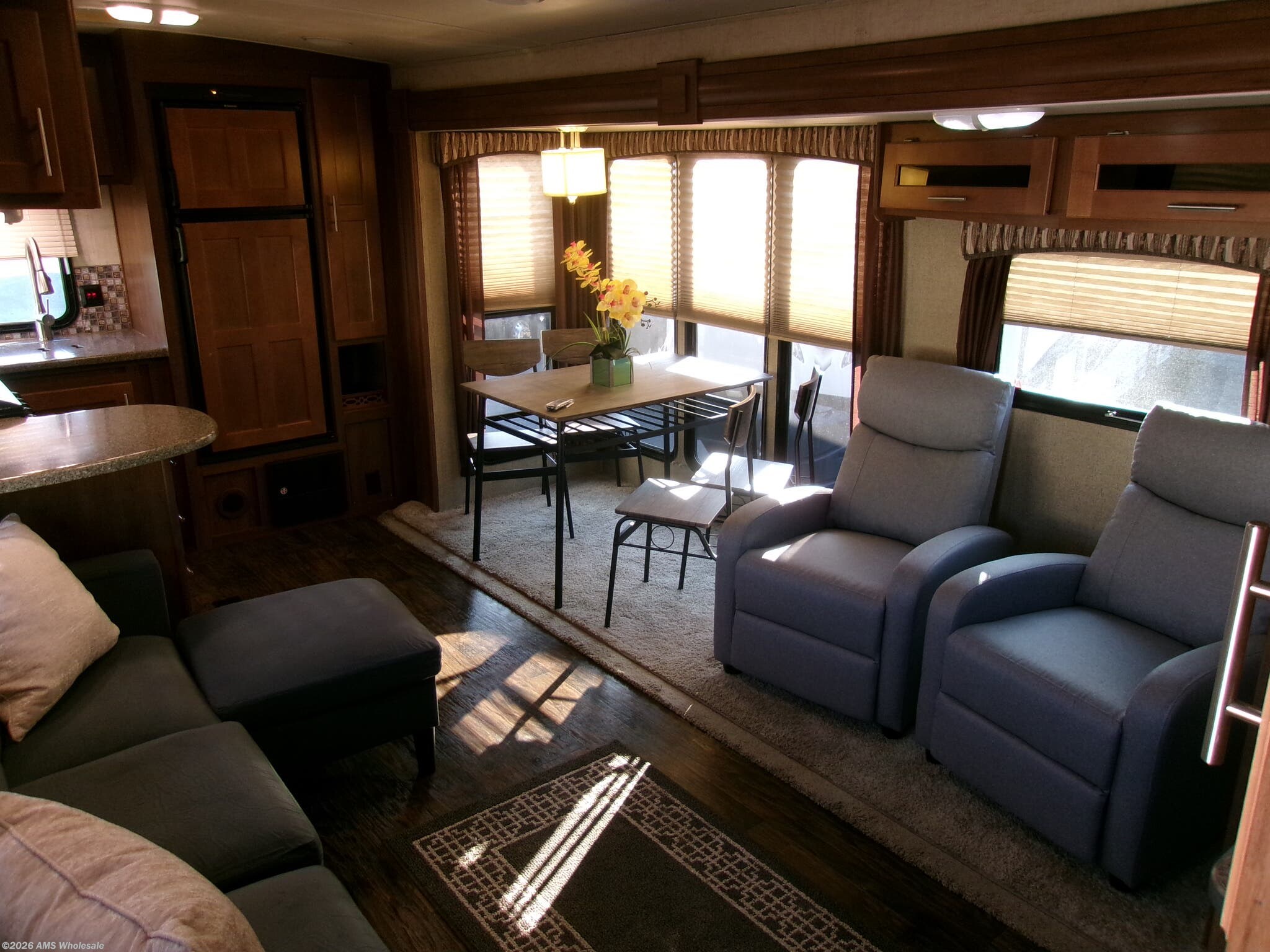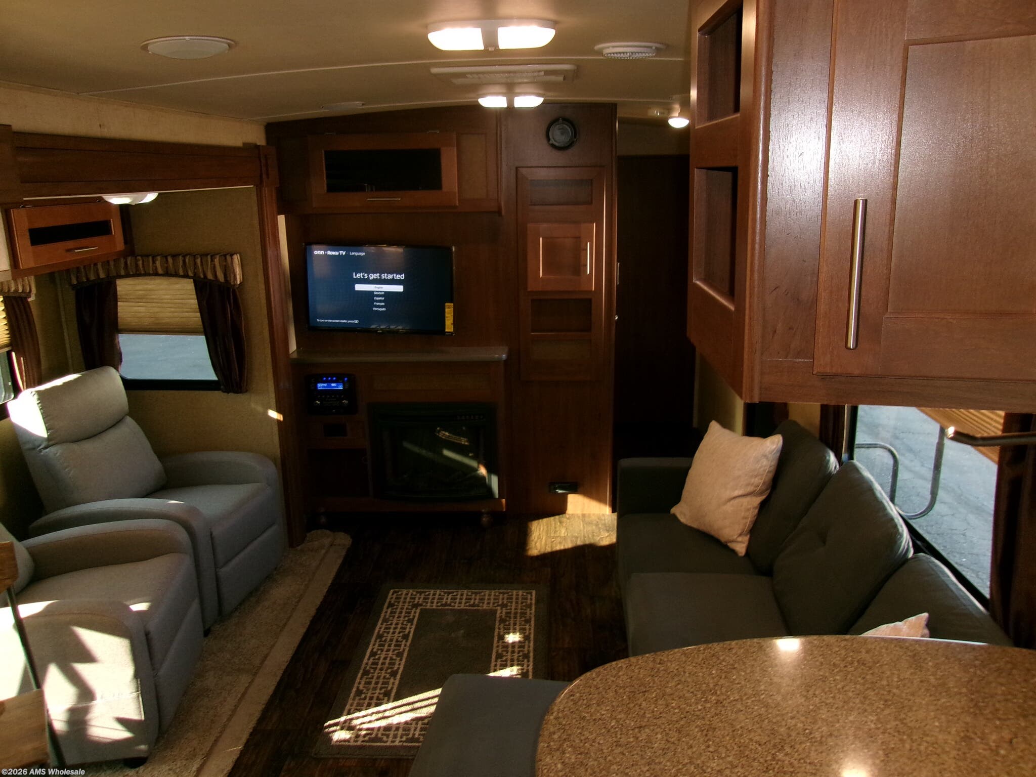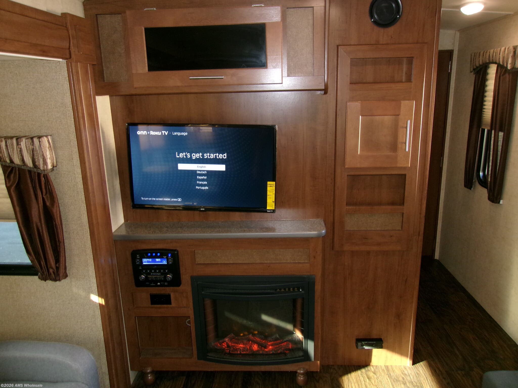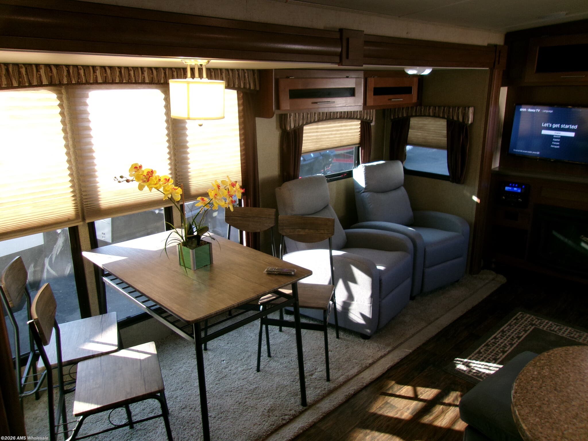 Key amenities include solid surface countertops, a fireplace, 2 leather recliners, 2 TV's, a queen-sized master bed, dual entry into bathroom, outdoor speakers, electric leveling jacks, and much more!!