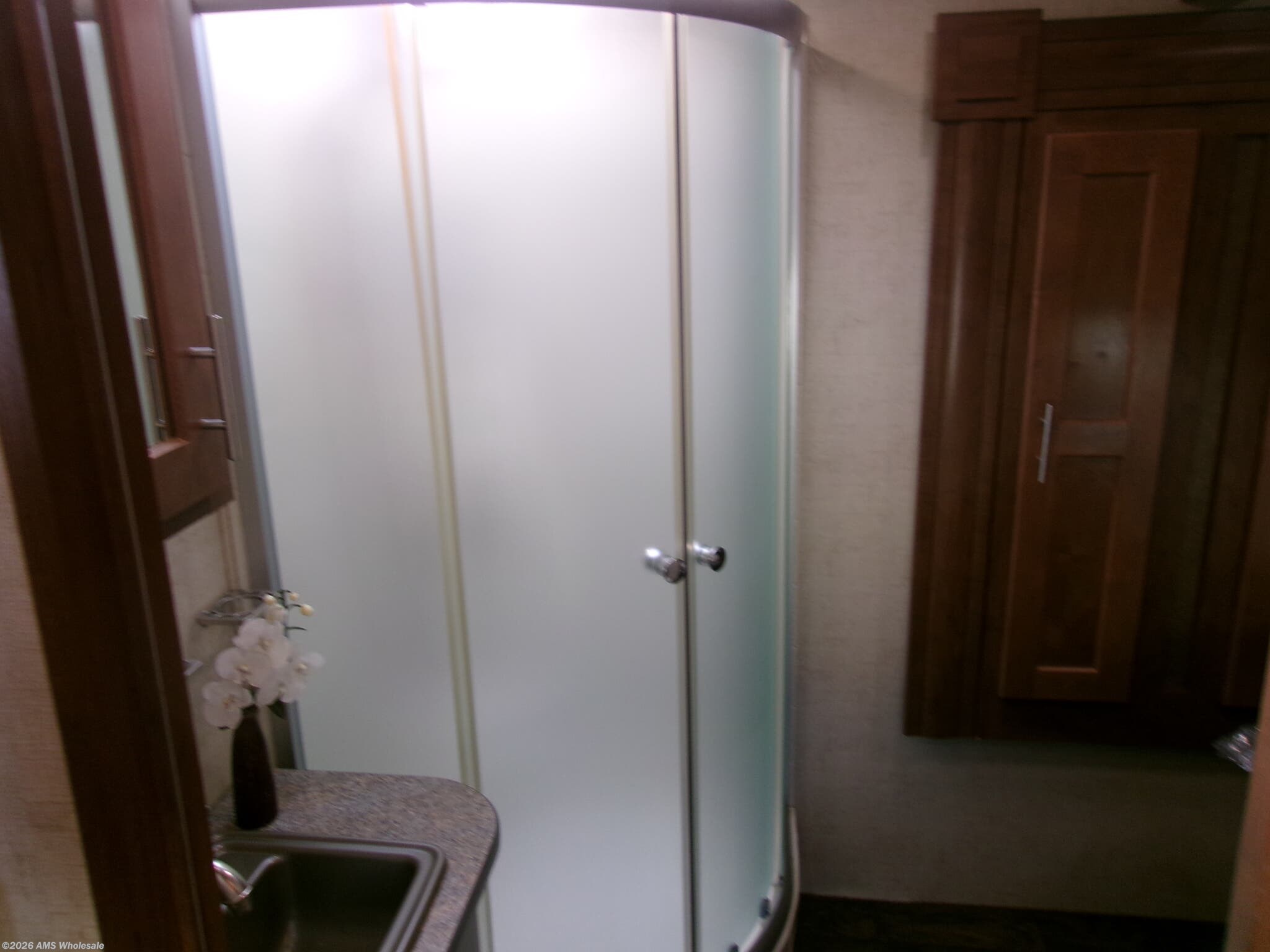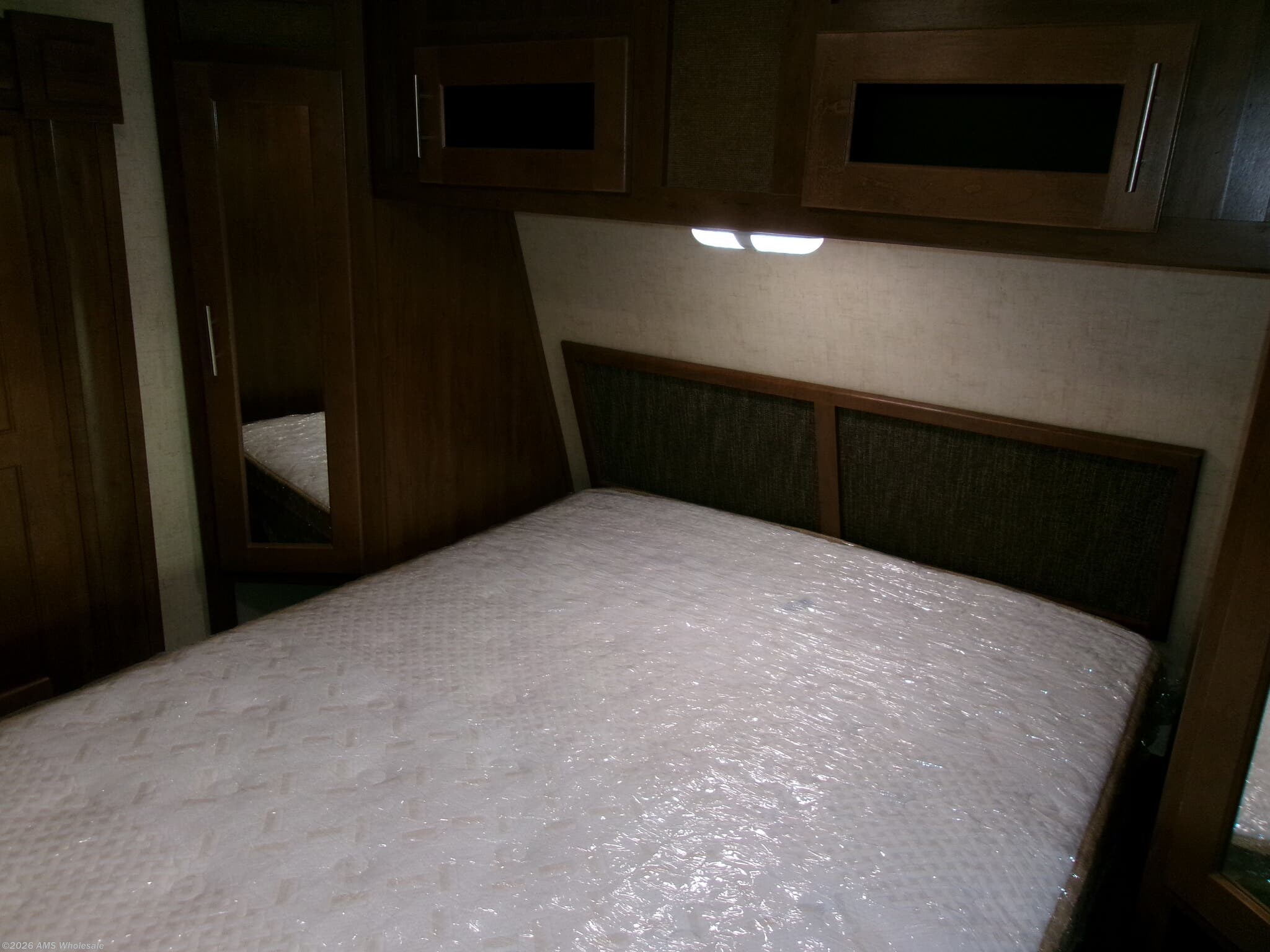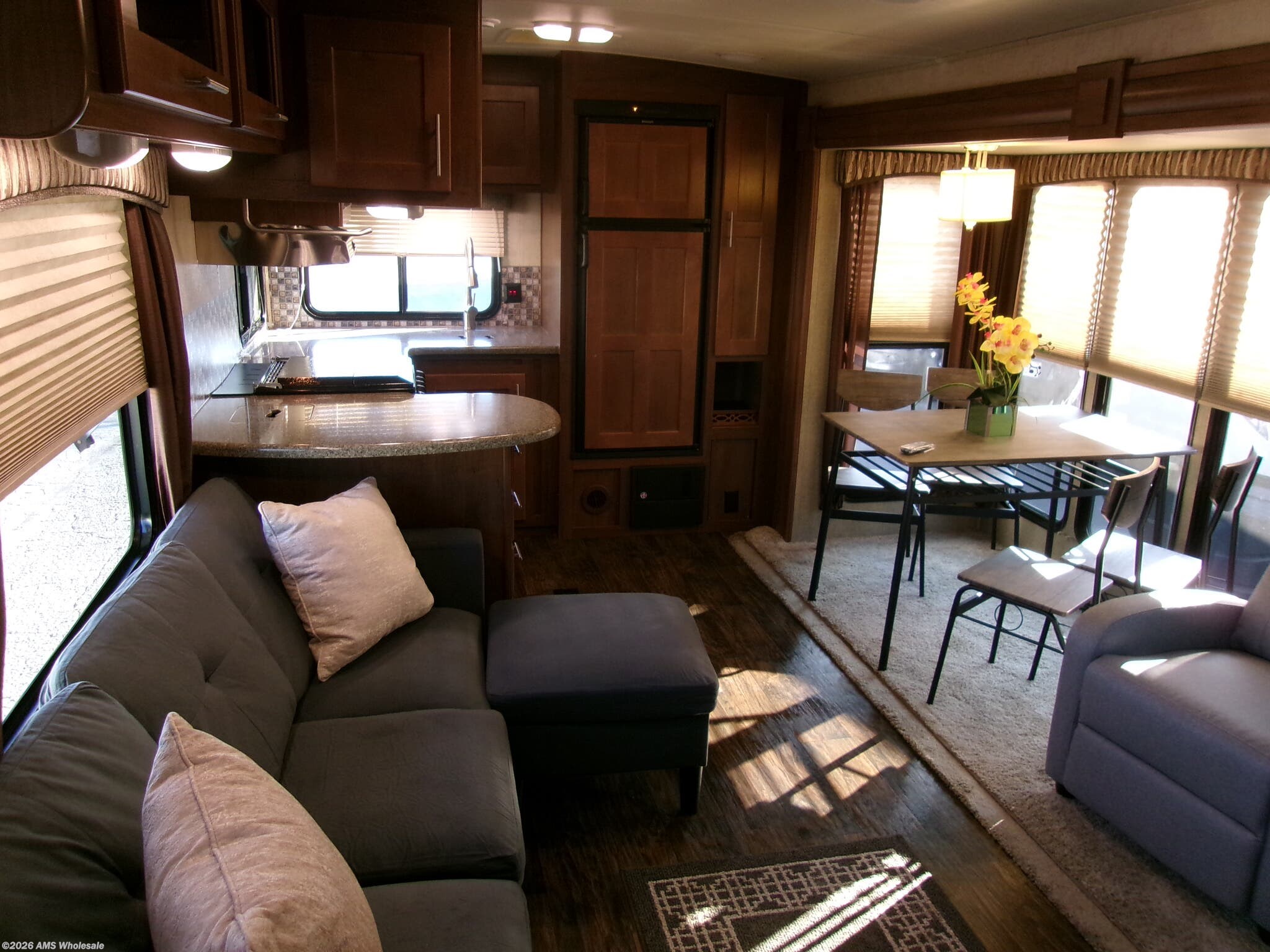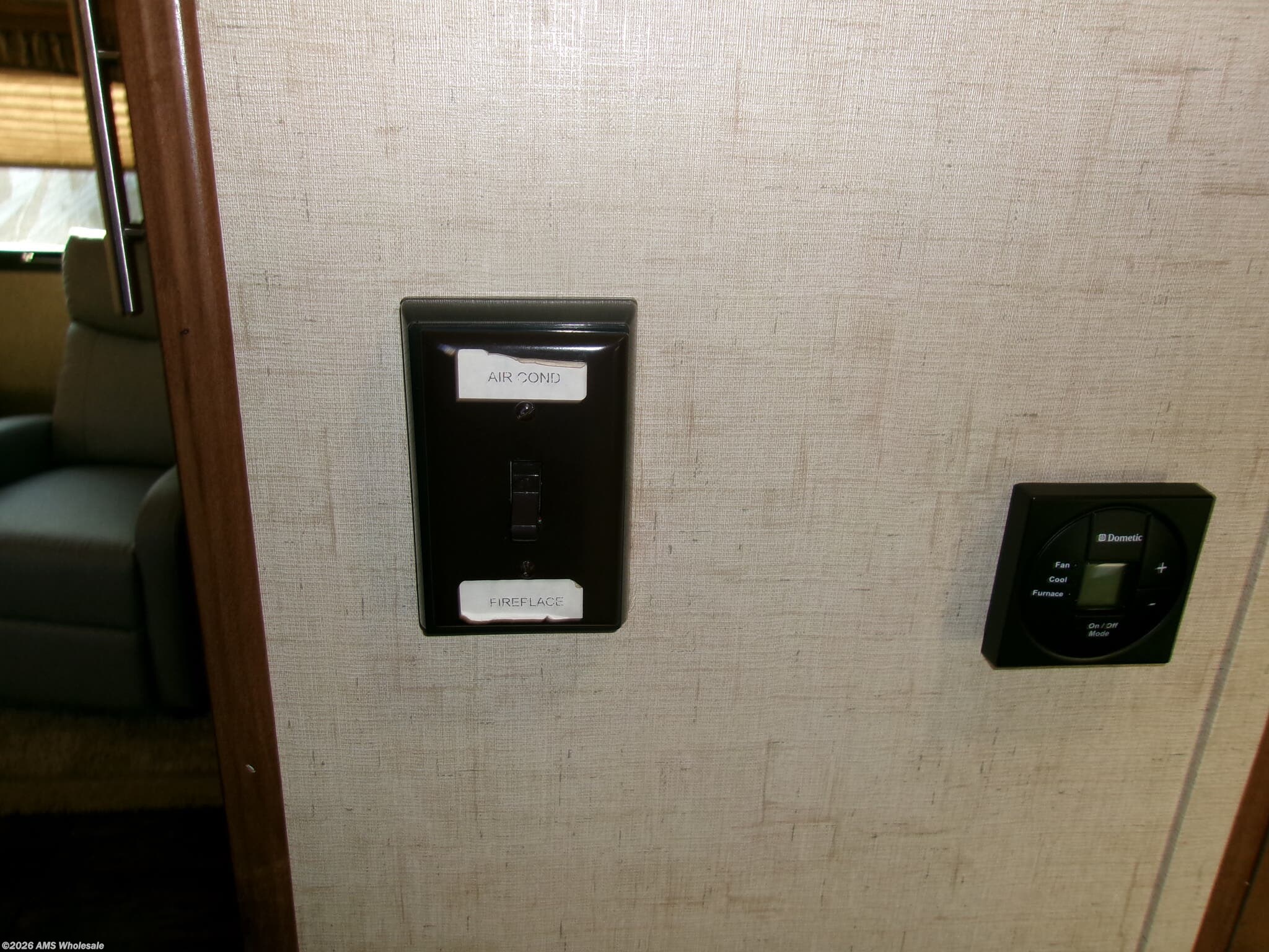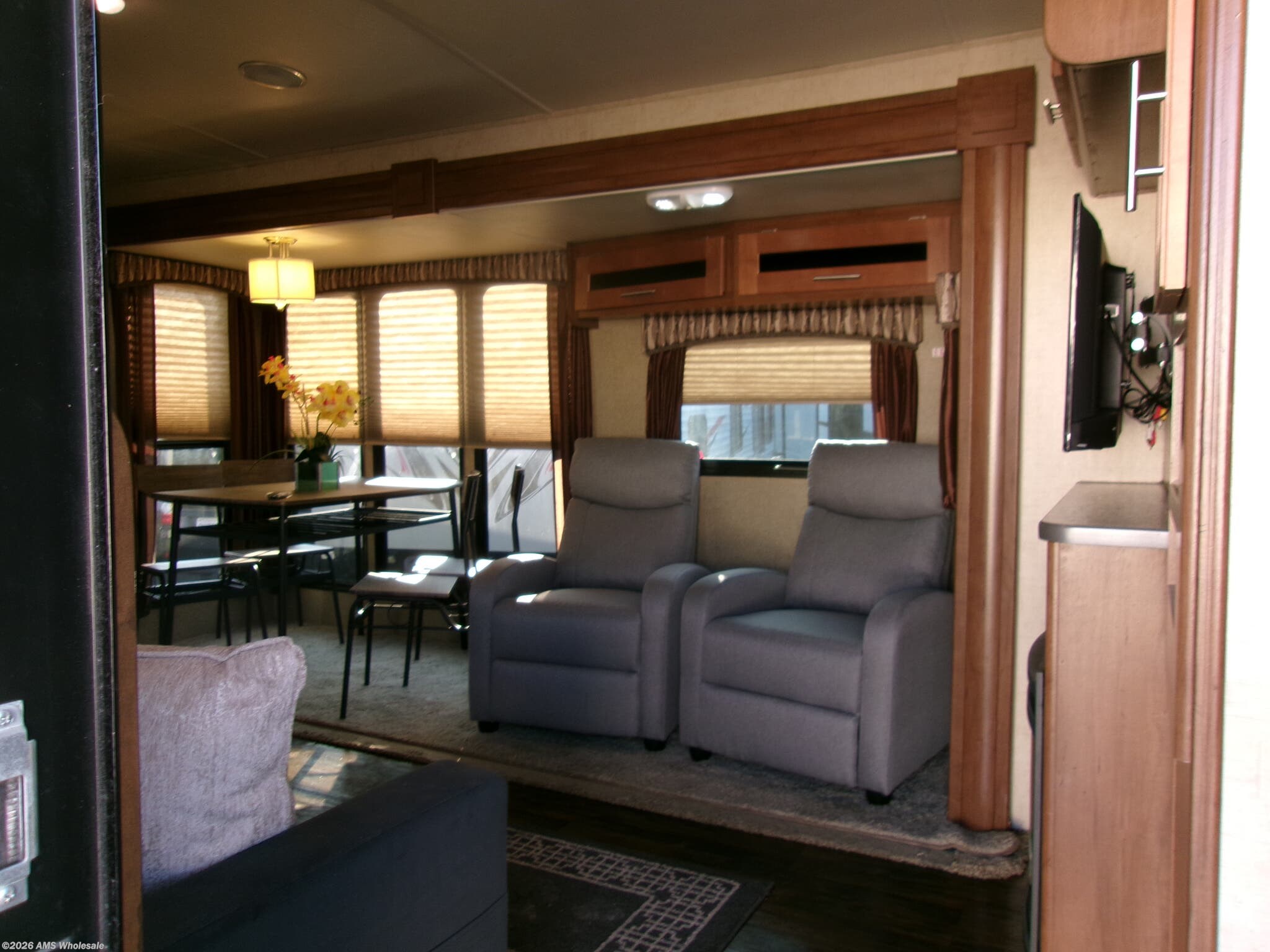 Key amenities include solid surface countertops, a fireplace, 2 leather recliners, 2 TV's, a queen-sized master bed, dual entry into bathroom, outdoor speakers, electric leveling jacks, and much more!!