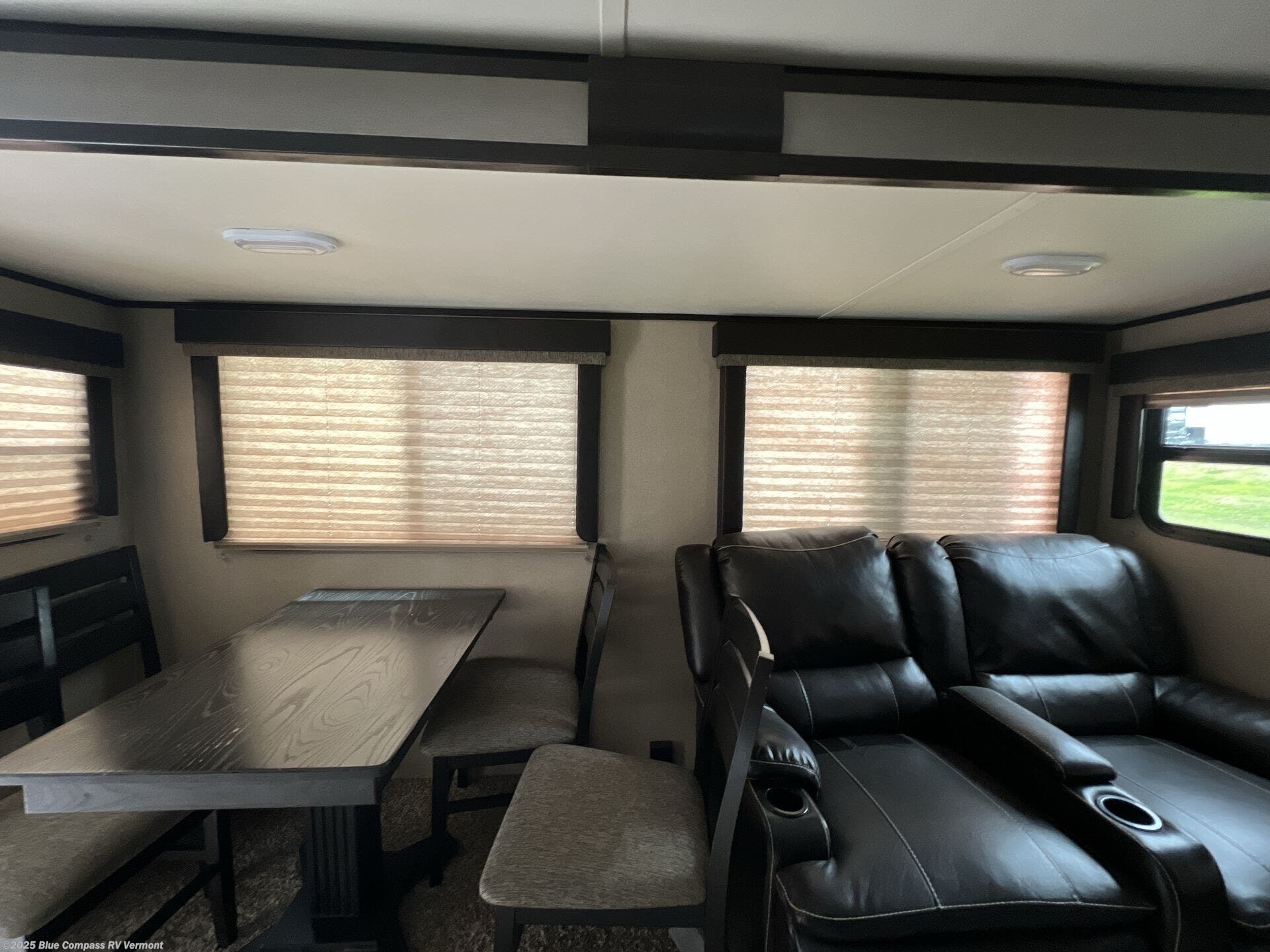To the left of the main entry door find a slide out booth dinette or optional free standing dinette along with theater seating for two including center cup holders. The booth dinette can easily become added sleeping space when needed for overnight guests.