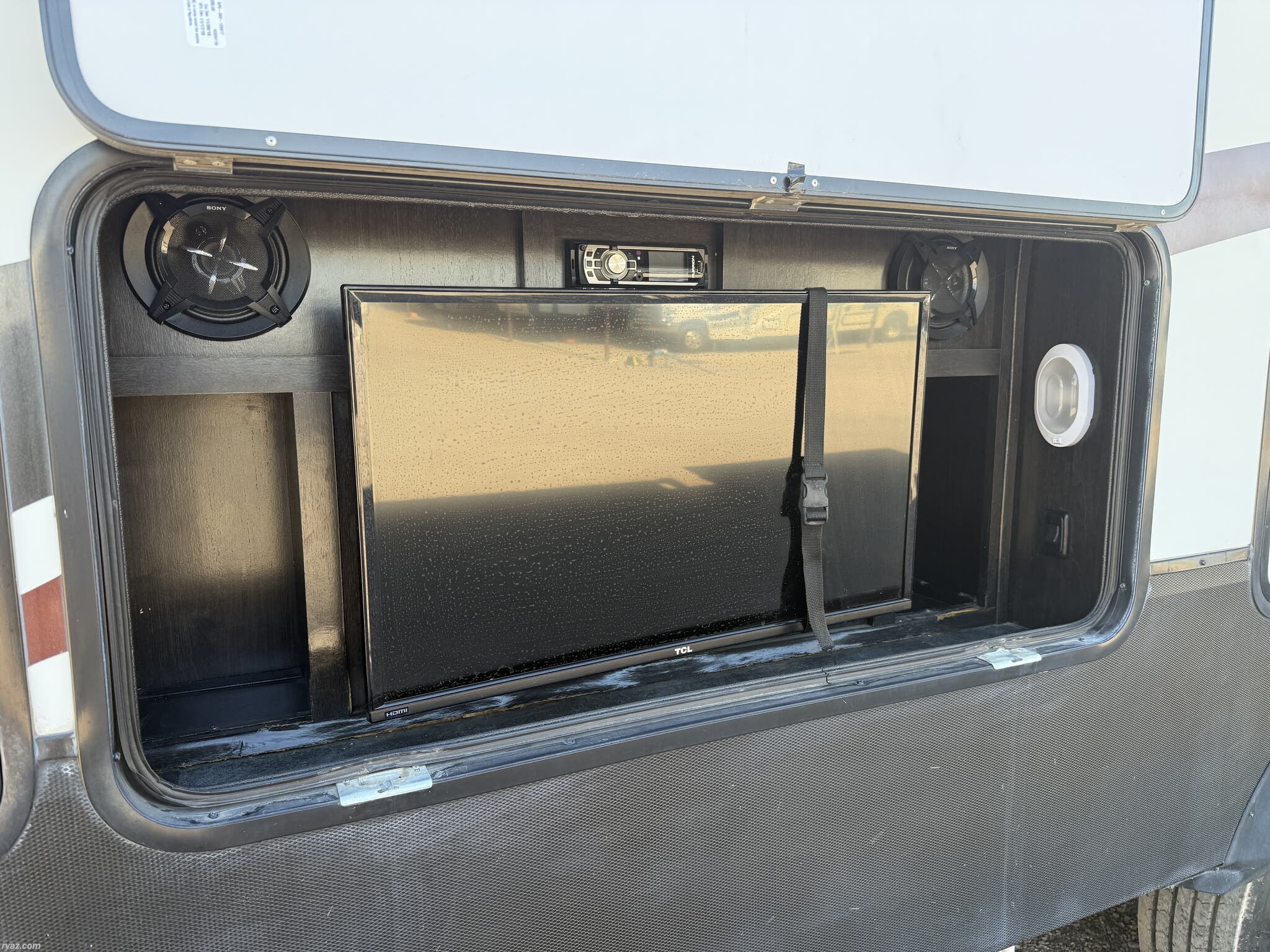 Automatic Leveling Jacks, Awning, Black Tank Flush, Detachable Power Cord, Enclosed Underbelly, Exterior Speakers, External Shower, Fiberglass Sidewalls, Ladder, Leveling Jacks, Outside Kitchen, Pass Thru Storage, Power Awning, Power Roof Vent, Screen Door, Skylight, Slideout, Spare Tire Kit, Tinted Windows, Upgraded Insulation Package -