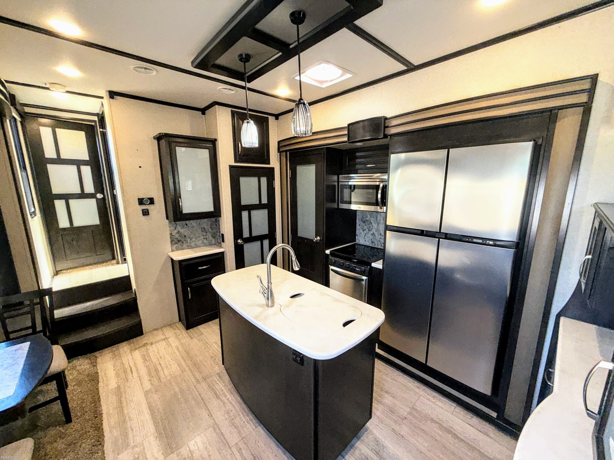 - Water capacities include 117 gallons fresh, 52 gallons black water, and 104 gallons gray water tanks for extended trips